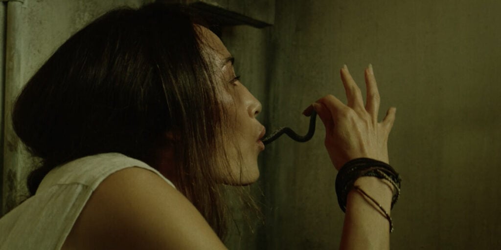 After vomiting soil, Christine soon pulls a small black snake out of her mouth. Typically, in Thailand, snakes are seen as sacred manifestations of gods and goddesses, and they can bring luck and wealth. But, the depiction of a small black snake in Thai traditions is a very ill-fated omen and bad luck is slithering its way towards the unfortunate victim.