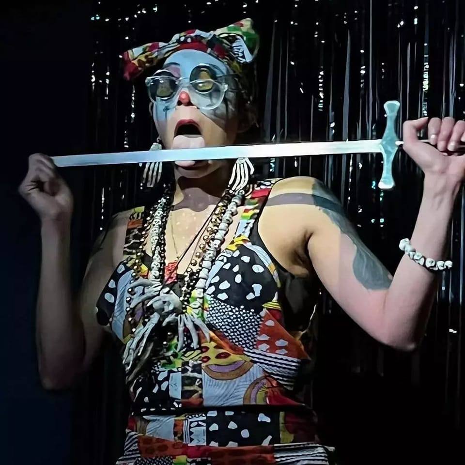 “I tell jokes that only old people seem to get. I am a sideshow clown/performer. I fire eat/breathe, do traditional sideshow acts such as blockhead and… bed of nails. Hula hooping and balloon twisting. I specialize and am mostly known for the ancient art of sword swallowing.”