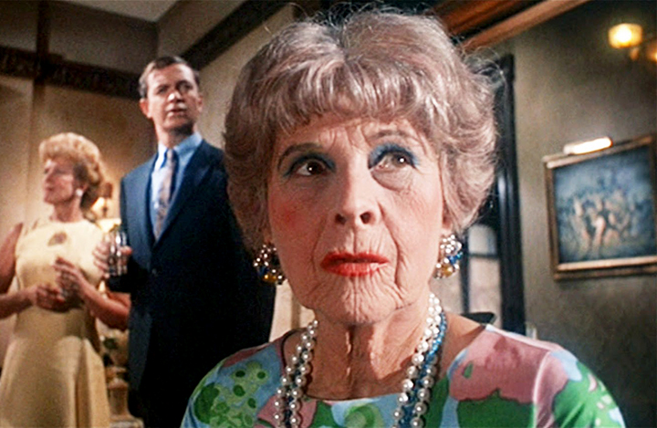We’re introduced to Minnie in Rosemary’s Baby by her deeds and her voice. Rosemary Woodhouse (Mia Farrow) and her husband Guy (John Cassavetes) have just moved into a spacious apartment when they hear an older couple arguing on the other side of the wall. Careful listeners will also hear ominous chanting, foreshadowing the satanic violence to come. During a chance meeting in the laundry room, Rosemary discusses the diminutive woman with a fellow resident named Terry Gionoffrio (Victoria Vetri) who credits Minnie (Gordon) and her husband Roman (Sidney Blackmer) with saving her life. A few days later, Terry falls to her death from one of the building’s upper floors and it’s in the shadow of this tragedy that we finally meet Minnie. On Roman’s arm, she emerges from the night in a psychedelic coat and flowered, white hat, a flamboyant outfit that mirrors her outsized persona.