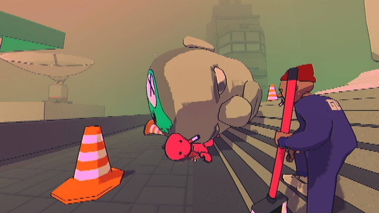 The level of interaction with the world is fantastic. One of Glug’s corporate mascots is Ciggy; a red, smiley-face bedecked weirdo who encourages you to smoke. Cigarettes can be found around the world, and with a push of a button you can burn one. This ties into an app on your laptop called “Smoke With Ciggy”. It keeps track of how many cigarettes you’ve smoked. There are no warnings about the dangers of smoking because Sludge Life isn’t in the business of caring. It’s casual nihilism, all the way down. Later, you’ll find Ciggy crushed to death underneath the head of a massive statue. Smoking kills, everyone.
