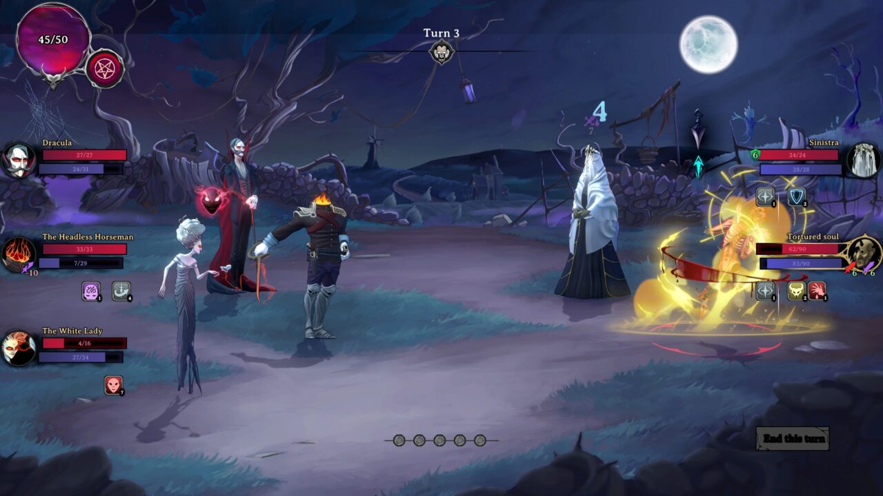 I stopped by one of the shop areas -naturally run by the grim reaper – and picked up an attack for The Headless Horseman that caused a status called “zombie”. Zombie status turns healing into damage. When I’d see enemies getting ready to pop heals, I’d drop my newly-minted attack on them, making their heals hurt or outright kill them. It’s the small adjustments that make Rogue Lords interesting. You’ll never become overpowered, but you’ll learn to think. As you get better, you’ll start chuckling at the decisions you made in the early game before you knew stuff.