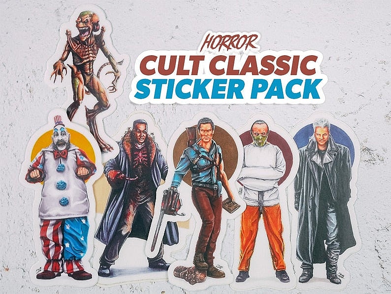 In addition to his posters of reimagined epic battles between horror characters and Marvel & DC characters, Stevan has a variety of horror character prints/stickers you can choose from, including: Leatherface, Candyman, Michael Myers, Gizmo, Jason Voorhees, Freddy Krueger, Ash Williams, Hannibal Lecter, Captain Spaulding and Pumpkinhead.