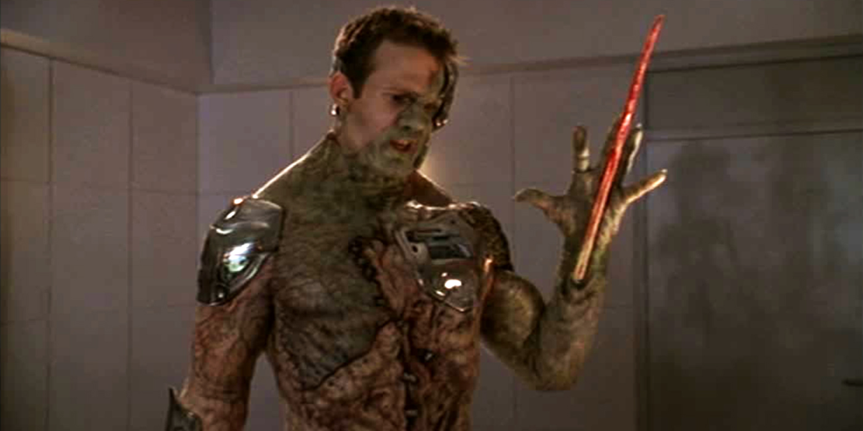 Jeff Goldblum stars as Seth Brundle, a brilliant and committed scientist who is developing a machine that can facilitate teleportation between two pods. Despite being successful in teleporting inanimate objects, the telepod has failed with live subjects. When experimenting with the machine while drunk, Seth teleports himself. But unknown to him, a fly also enters the machine, resulting in Seth’s transformation and consequential deterioration. The similarities between scientist Seth Brundle and Dr. Victor Frankenstein are undeniable, with both abusing science and messing with a natural order of life to disastrous effects.