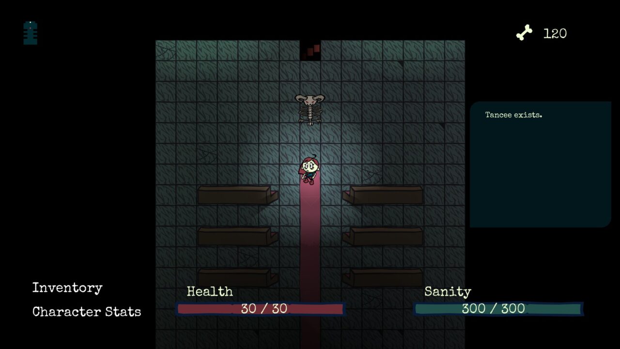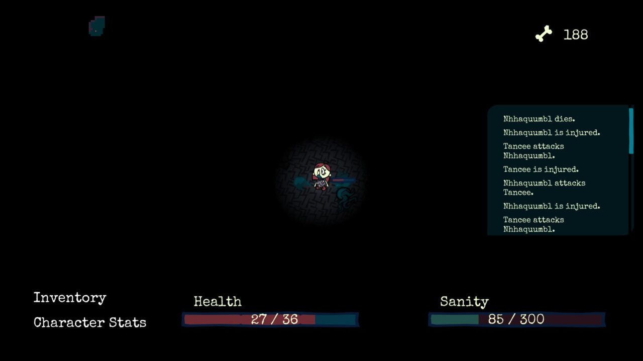 The monster design is the perfect blend of Lovecraft-inspired tentacle monstrosities and a bit of Saturday morning cartoon goofiness that I frankly find charming. There are no blast-processed hyper-realistic shambling horrors to be found; just goofy tentacle bros. As you pick up more mutation upgrades, your character will visually change to show off your new parts, which I really like. Your stamina (sanity) and health are both displayed clearly, with sanity running out with every step. This becomes an issue if you’re in a particularly spacious dungeon with too few sanity pickups. With levels and drops being randomly generated, the outcome sometimes isn’t great, though it comes pretty close more often than it misses. The developer has realized this, and in a subsequent patch scaled-down the size of dungeons.