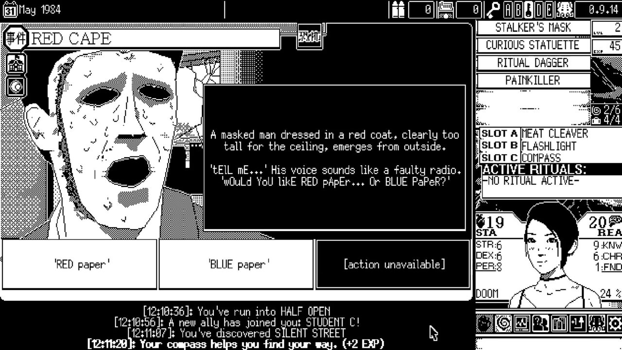 The viewport for the game has the option to play bordered within the graphic of a lone computer in a vacated office room in almost complete darkness. The primordial fear the game wants the player to feel is perhaps too much for some, it was too much for me. Scares can be subjective, I’m sure plenty don’t find World of Horror scary at all. For people shaking in their skeletons, I’ll bet some of them felt the loss of autonomy I did, perhaps my comprehension of space, isolation, and reality, got a bit too metaphorical than I was able to handle.