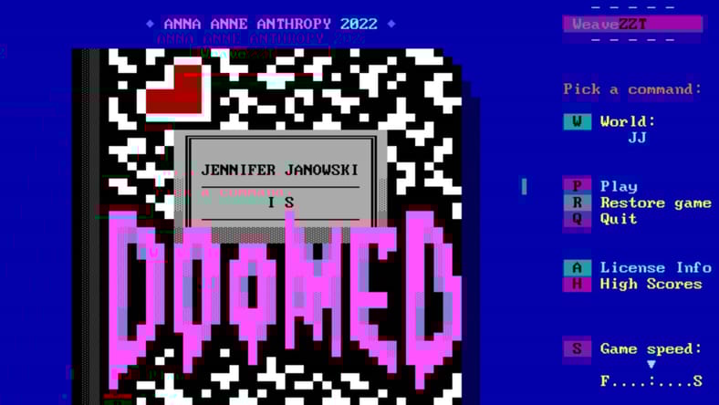 Jennifer Janowski is Doomed was made in WeaveZZT, a modified version of the engine, which allowed Anthropy to do more with it than the vanilla version of ZZT. Anthropy is very active within the ZZT community and invites curious players to join the Museum of ZZT, which also has a Discord.