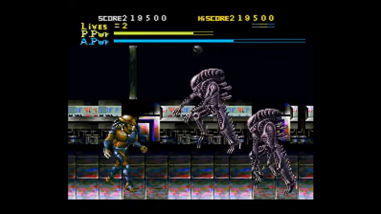 As a beat ‘em up, you can swing your fists around to deal with your enemies. However, as a Predator, you have far more than just your knuckles. You’ve got some handy wristblades to put the hurt on Aliens, for starters. You’ve also got access to jumping kicks, a spin kick that strikes all around you, and you can grab onto Aliens if they get too close. Then, you can throw or elbow them as you like. Better than all of those is the slide kick, which sends you flying across large portions of the screen and often takes your enemies right off their feet. Super handy if you’re getting surrounded.