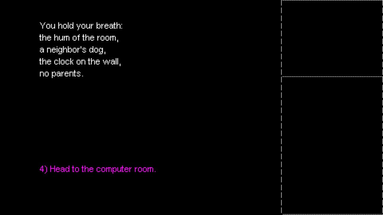 The “look behind you” text can also increase to massive size, forcing you to click it. You Must be 18 or Older to Enter will have you hesitating, here, as it feels like these are the moments when you’ll turn to see your parents looming behind you. When the text is small, it still creates this constant need to check to be sure you aren’t being observed. When that text gets big, it feels like the game’s telling you that you’re caught for sure. Someone is behind you, for sure. That text size increase is usually accompanied by some sound, too, which makes your discovery feel all the more likely. Hitting the button to turn around feels like willingly facing down some monster hiding in the dark. Like giving in to death, in its own way.