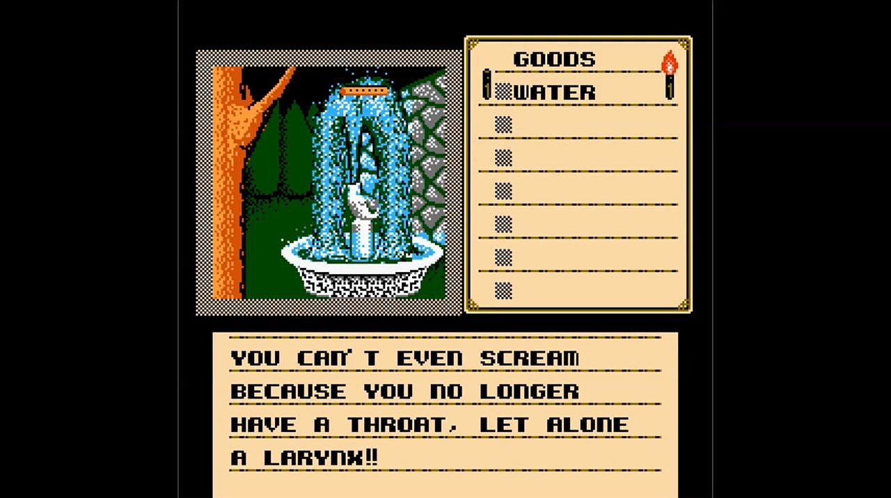 None of the deaths in Shadowgate are visually violent. Instead, this game makes it on the list of the most gruesome NES deaths because of the written text explaining how you died (which I’ve gone on about before). It often goes into graphic detail about your body exploding in lava, blood pouring from self-inflicted wounds, or how little is left of you after a monster attack. The most vivid of these is when you drink from an acid fountain. It is awful hard to scream when your throat and larynx have burned away, for sure. While you’re not seeing any of these sickening outcomes, the writing paints a very clear picture of these brutal ends.