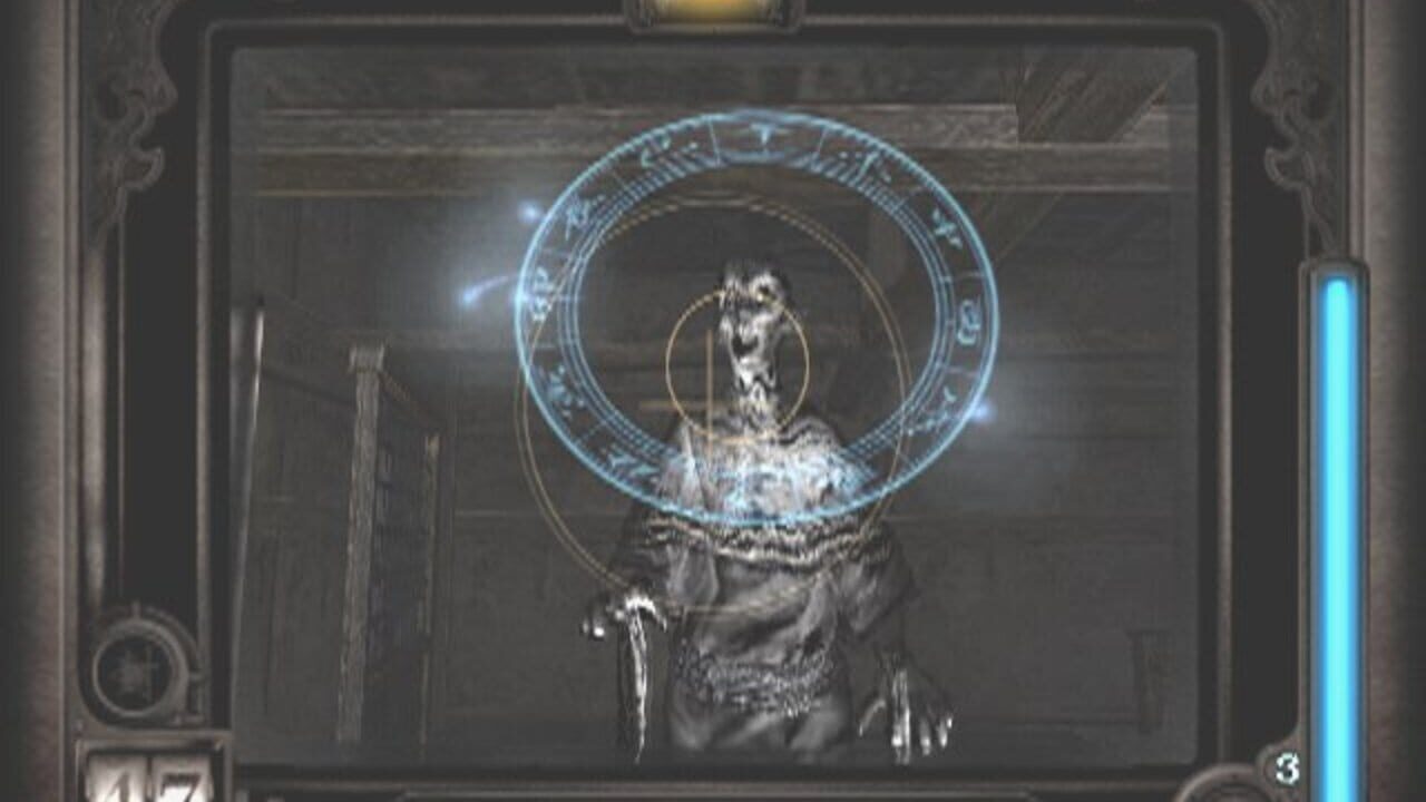 We quickly find the Camera Obscura, this camera that takes pictures of ghosts with unique film and lets us exorcise them. When we pull up the camera, we are treated to a first-person view with an awesome HUD. Here we can see the camera’s power level, how many special ability spheres we have, and how much health the ghosts have.