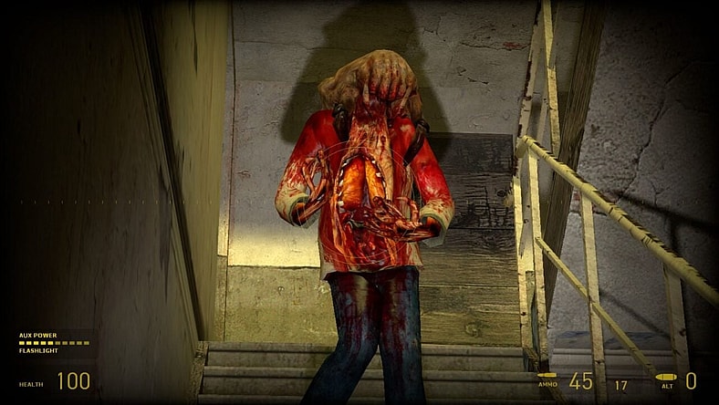 And while memorable in the original game, I have always found Half-Life 2’s zombie design especially heinous. The same cosmic horror aesthetic returns, but the zombies make horrible utterances that sound like muffled screams from those being controlled. Furthermore, when killed, the Headcrab affixed to a host’s head will fall off, revealing the twisted and contorted face of the poor soul whose life was cut short. The victims’ faces are never mutilated to the point of being unrecognizable; instead, the haunted look of them realizing their fate in their final moments remains.