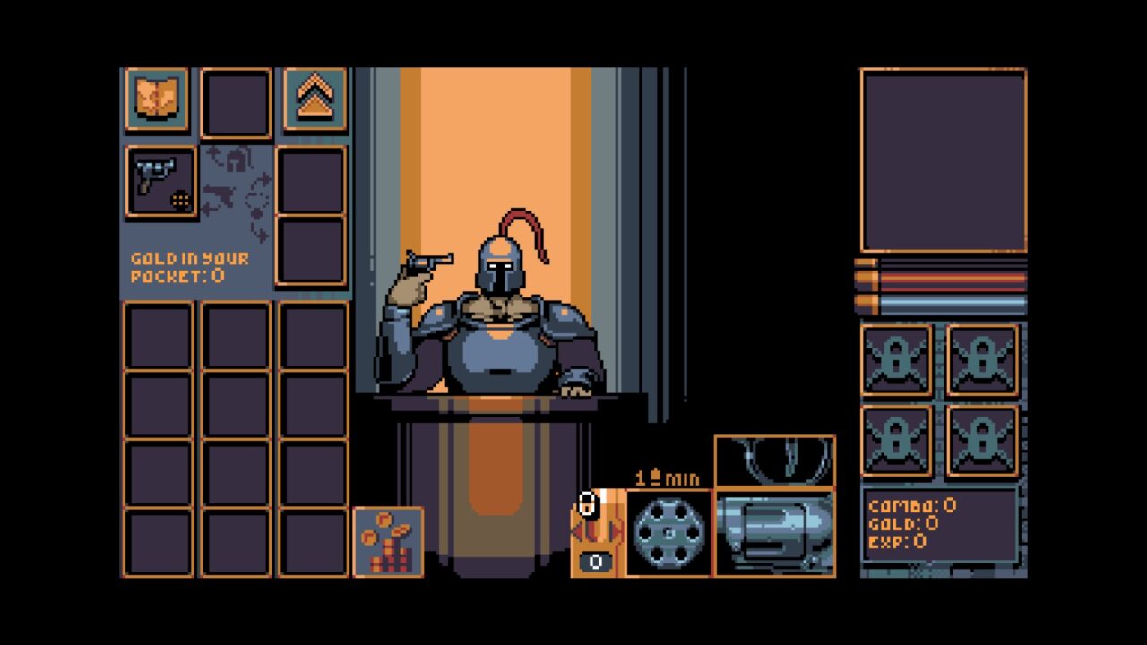 I’m not sure why you grow stronger and more resilient by nearly shooting yourself. There’s not exactly a plot behind what you’re doing. At least, not one that the game tells you about. All you know is that you’re a knight. You have a gun. For whatever reason, you keep firing it at yourself. Probably because you get stronger every time you fire on an empty chamber. RPG heroes will do real strange stuff to get tough. Anyway, the premise is fairly simple. You load one bullet into a revolver’s cylinder. Close it up and give it a spin. Pull the trigger.