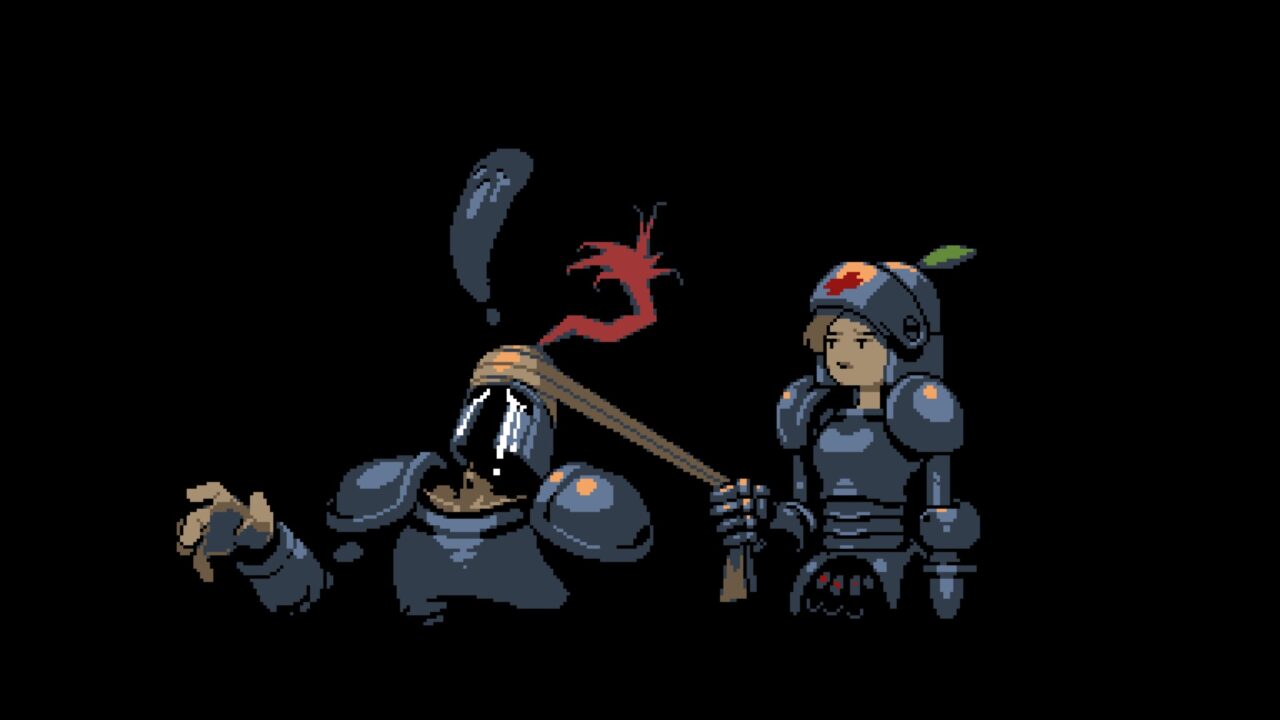 You’ll screw up eventually. It’s bound to happen. While you can survive this shot, it’s still a jarring thing to watch. The bullet quickly rips through the knight’s head. A gout of blood follows it. The knight collapses a little. It happens very fast, and despite the charming pixel art, I still jump every time. The suddenness of the violence and death hits hard, even as your knight shakes it off (if you’ve got enough health).