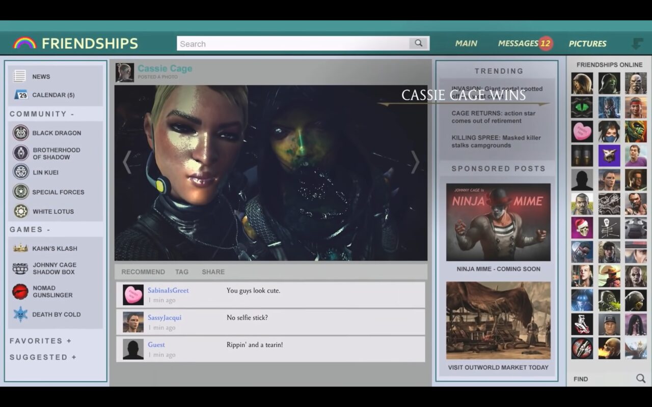 Smashing someone’s chin off with a pipe is a gross way to die, for sure. However, Cassie Cage brings a bit of social media fun to this Fatality. While her opponent’s chin is still hanging from a bit of ripped flesh, she leans in and takes a selfie to post online. Once the image of her and the dying opponent hits the web, you get a glance at her Friendship feed.