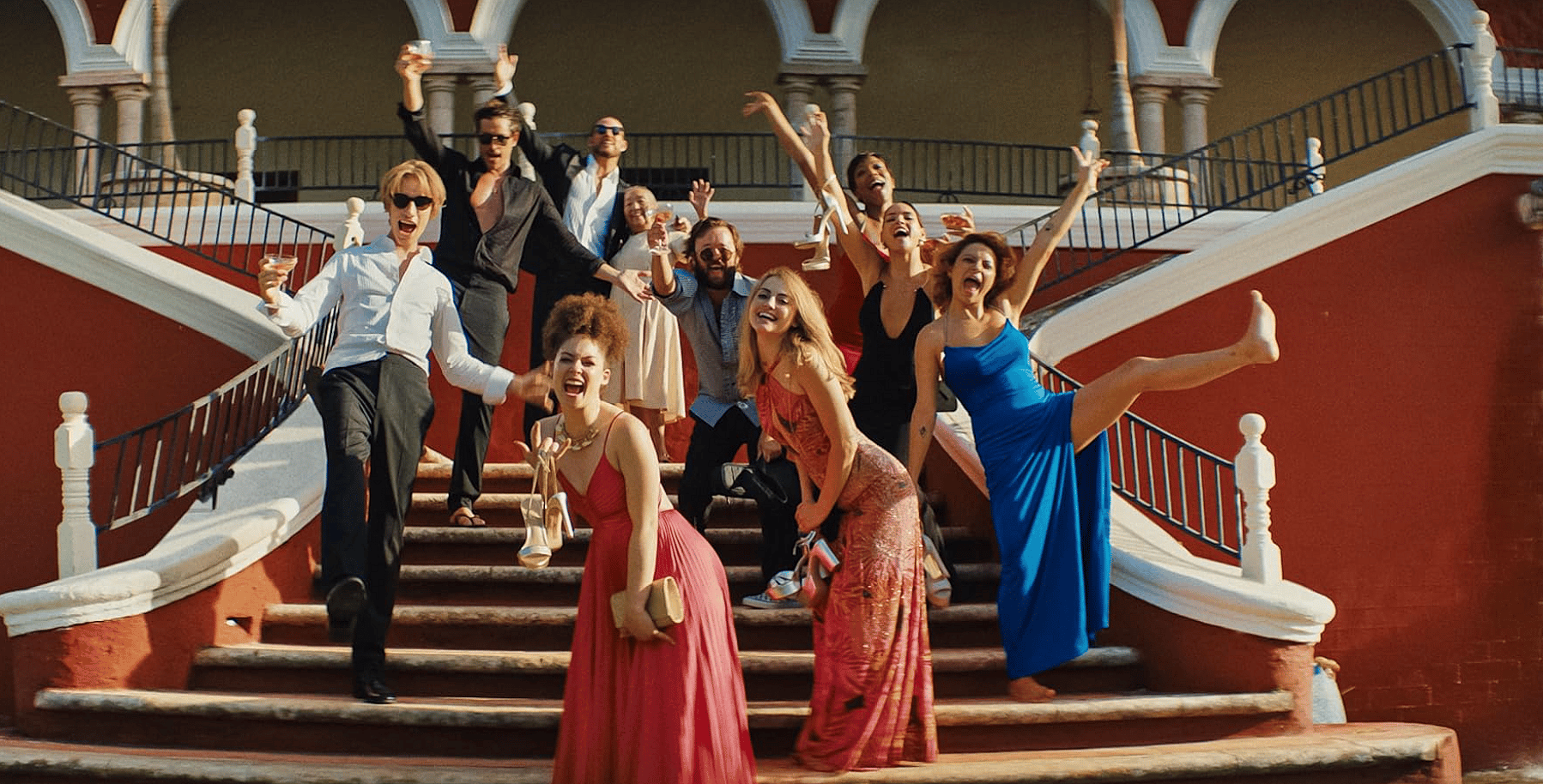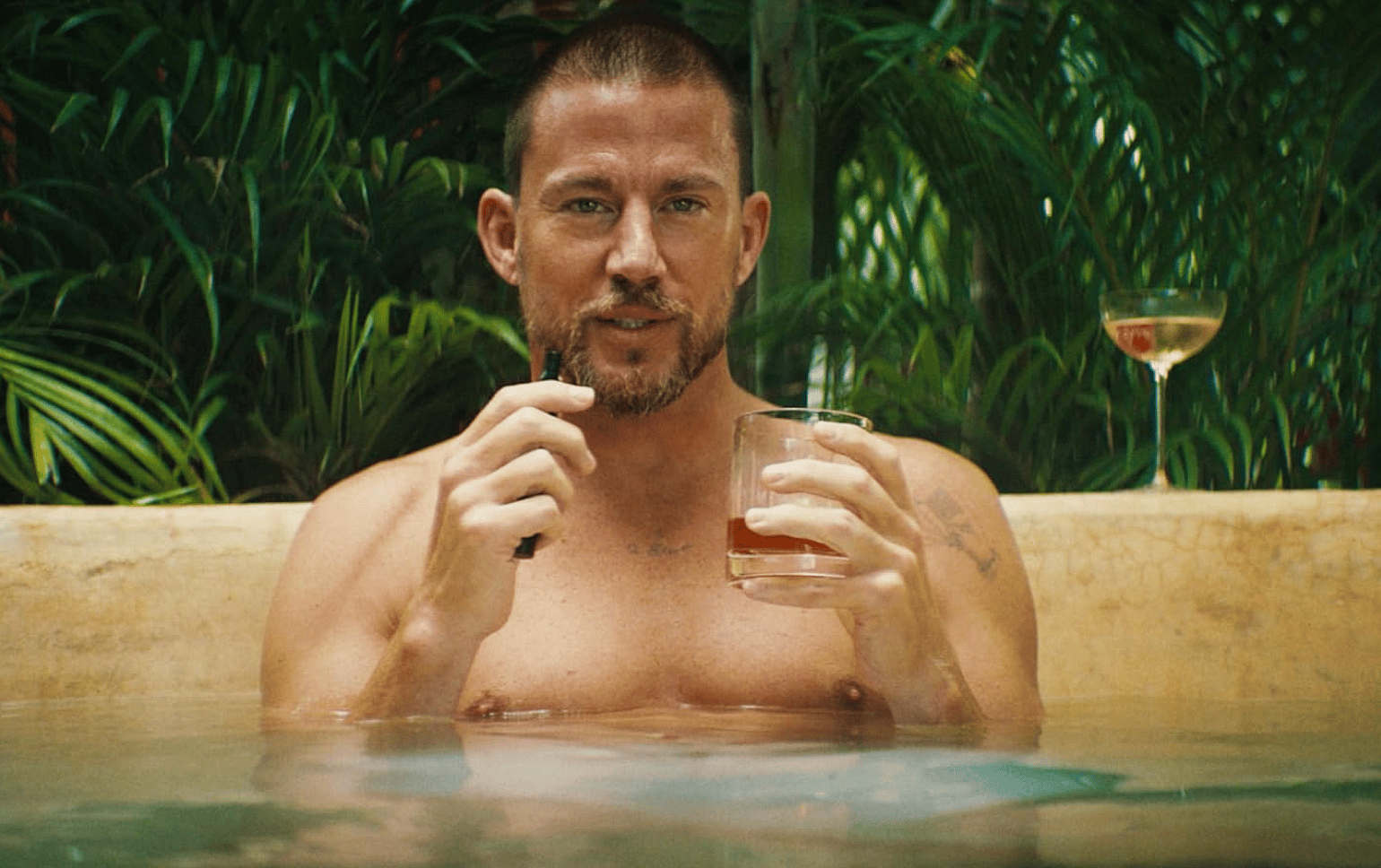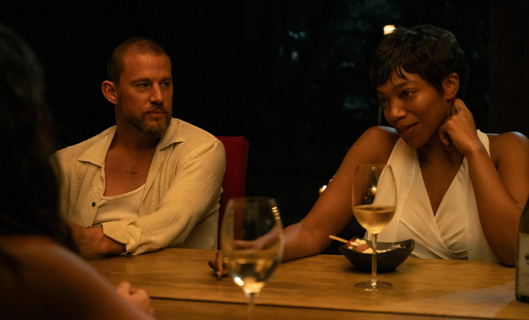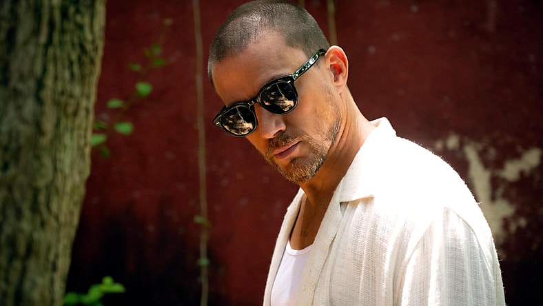 Blink Twice follows, Frida (Naomi Ackie), a struggling waiter and nail tech who trips and falls at the feet of dreamy tech billionaire Slater King (Channing Tatum). After this textbook meet-cute, she and her roommate Jess (Alia Shawkat) join Slater’s extravagant party and drink with his friends until the early morning. On a whim, he invites them both to the private island he bought in the wake of a public scandal. At first, this tropical paradise seems too good to be true. Slater is a generous host, providing luxurious private quarters, gourmet food, and an expensive, white wardrobe to account for the fact that they have no luggage. While the vibe is flirtatious, Slater and his male friends are respectful and seem to enjoy getting to know their beautiful young guests. Frida and Jess adorn themselves with the island’s unique flower-based perfume and while away the afternoons poolside at the picturesque retreat.