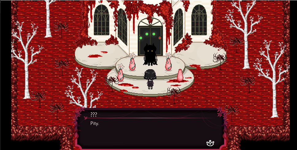 Project Kat lets you know what kind of game it is from the beginning. The tutorial goes from cutesy to horrific quickly and teases the player with the ominous message: There is always another way. You play as Kat, a teenage girl who decided to break into her school at night to complete an occult ritual in an empty classroom—ya know, that classic trope. Gameplay is mostly “find x to do y” scenarios with a few simple puzzles thrown in. This approach dovetails nicely with the 16-bit RPG aesthetic. In addition to wandering the school and collecting necessary items, you make decisions that impact gameplay or lead to one of Project Kat’s multiple endings.