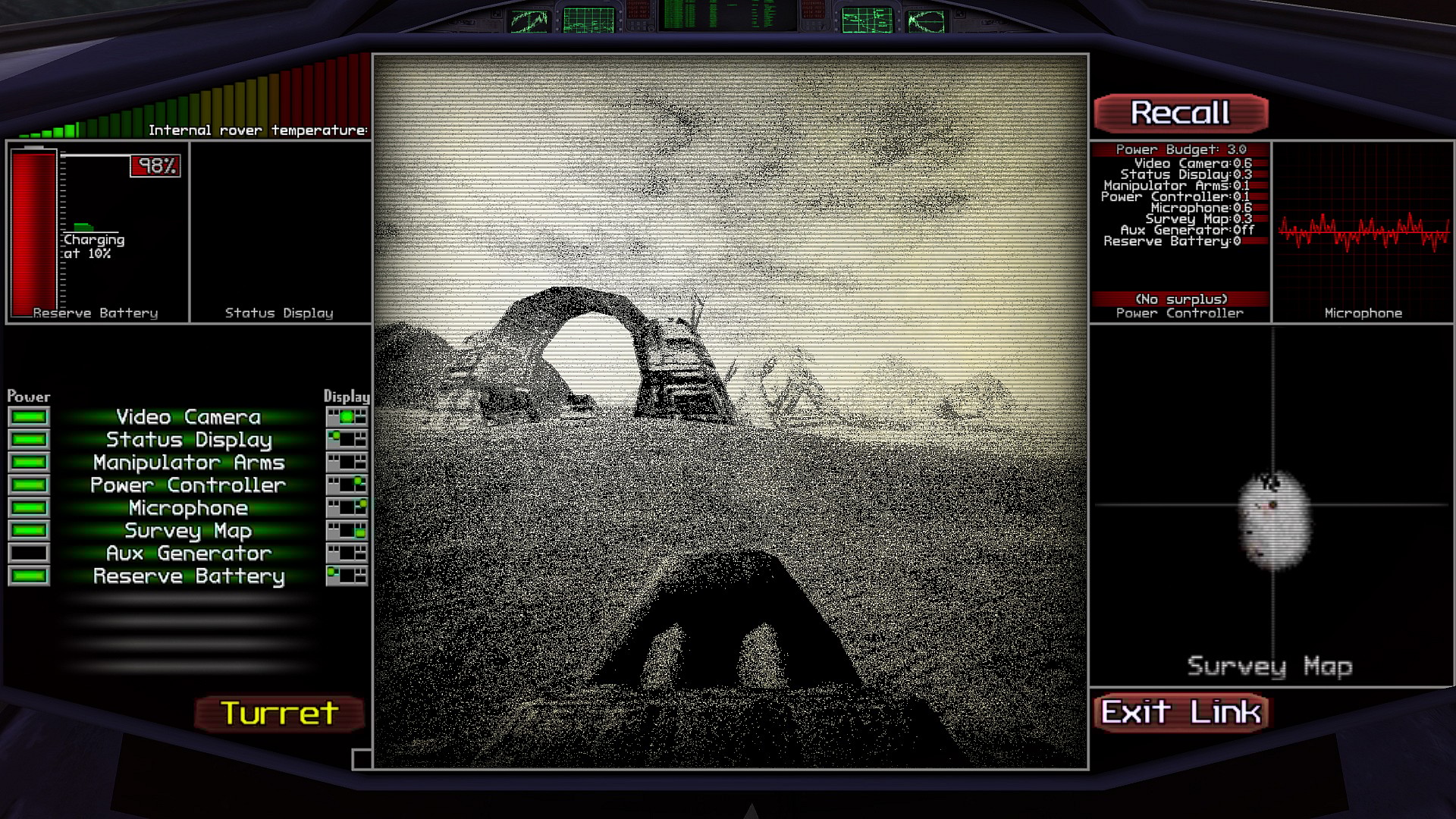 The gameplay of Scavenger SV-4 is somewhat clunky. Especially up in the ship. There are no real hotkeys for opening and closing doors, meaning you have to click the buttons on the side to shut doors behind you (which you really really should not forget to do, for no reason in particular). As for the drone, the awkward movement makes sense for piloting a small tank through a computer. That said, simply operating the thing requires upwards of eight out of the 12 module slots to be filled with operational equipment—power generator, camera, map, etc. With only four or five empty slots for storage of artifacts or equippable modules, I found myself wishing I had some more onboard space to further customize my rover.