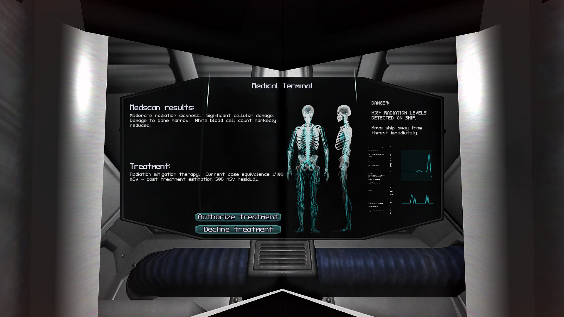 The gameplay of Scavenger SV-4 is a lot of you wandering around the ship in the first person, pushing buttons, and activating consoles. One console in particular lets you link up with the rover, cruise around the planet’s surface, collect some goodies and then recall the machine to the ship. Once it’s back, you can send off the artifacts to be analyzed, and either sell them or mount them on the drone if you think they’d be of use.