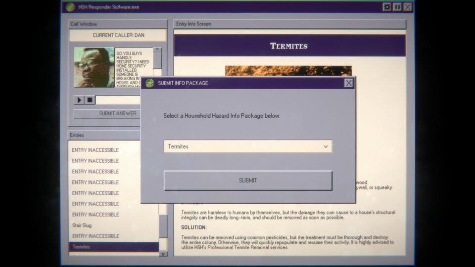 Home Safety Hotline sees the player step in the shoes of a phone operator for the titular Home Safety Hotline, helping out homeowners who come across usual homeowner issues like termites and spiders. Until things take a turn…