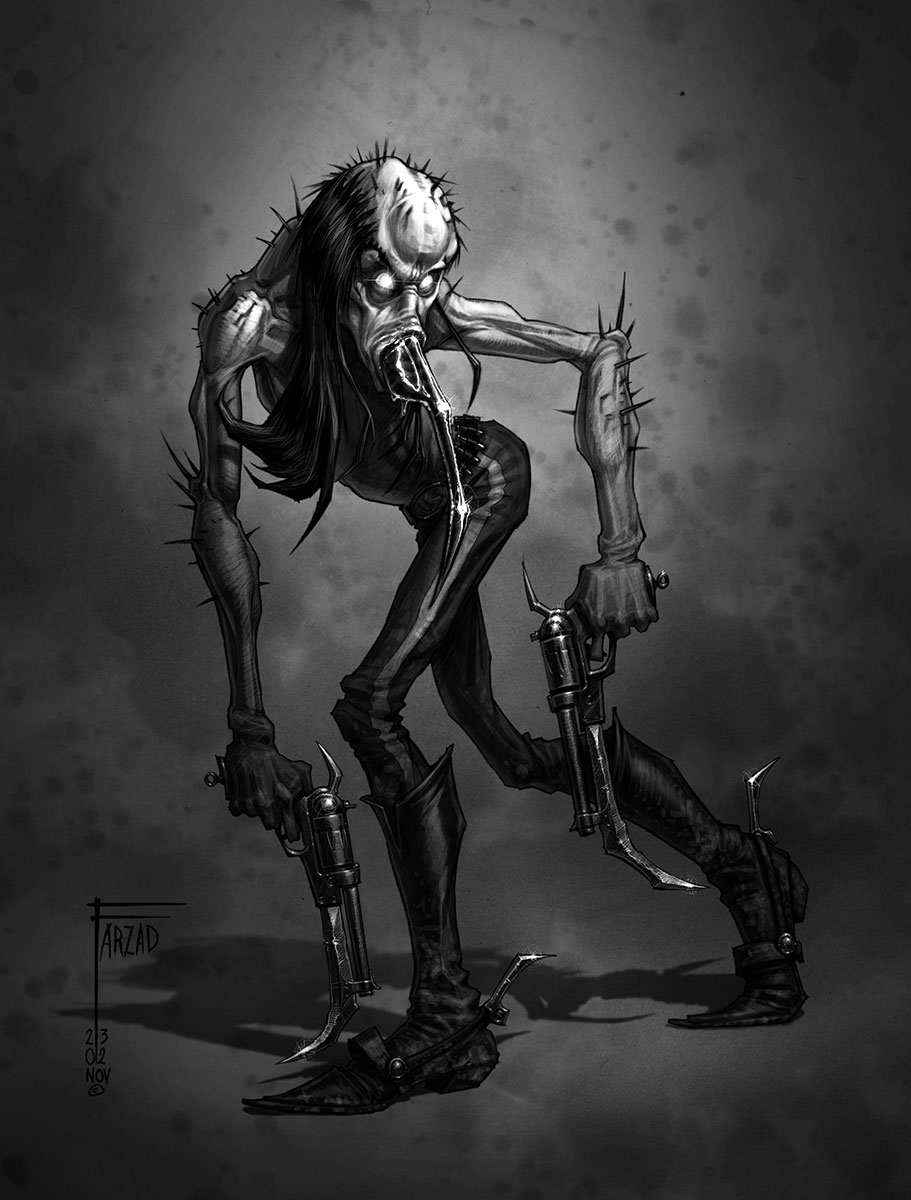 Concept artists are one of the game’s industry’s vital components, responsible for fleshing out the world and visuals of a game. Enemies, characters, environments, and weapons; all these and more are often drawn by a talented artist or team of artists before production begins to nail down the ever-important look and feel of a game. We decided to reach out to Farzad Varahramyan, one such wizard of the drawing tablet whose career has often taken a turn into the suitably spooky. Visual Director and Co-Founder of the awesome Wild West action-horror FPS Darkwatch (which you can read more about here), Farzad has also worked on creature design for the Alien vs. Predator movie series, The Vampire’s Assistant, and 2011’s The Thing prequel. We caught up with him to talk about his history with horror, creating creepy creatures, and his thoughts on the horror genre at large.
