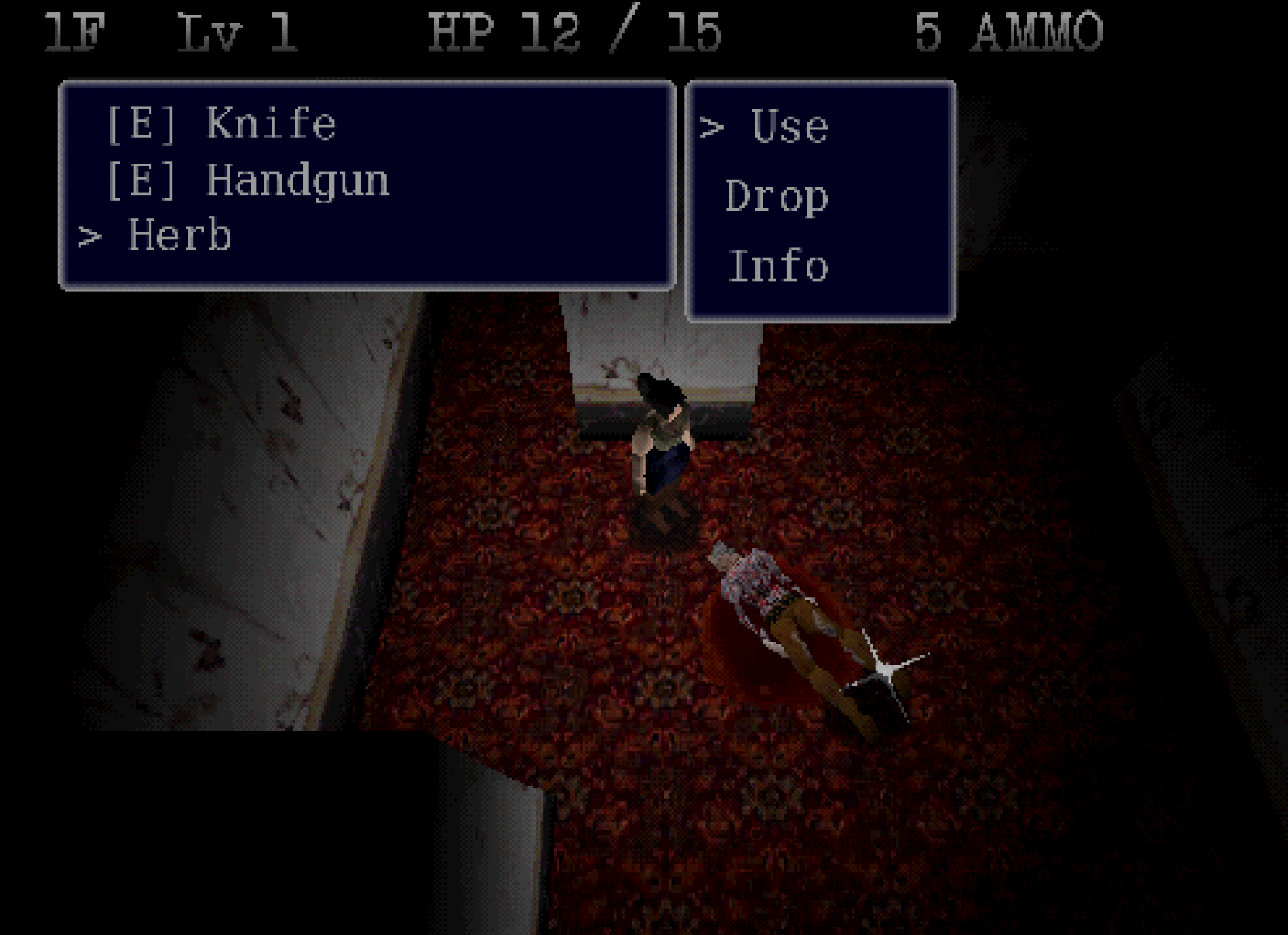 And yeah, of course, since I’m mostly making horror games, I immediately saw the connections between those Rogue-Likes, with its resource management, tense moments, you go around the corner, and then there’s the monster that’s stalking you kind of stuff. I immediately saw the parallels right there. And, yeah, just thought, that could be something that could be turned into some kind of horror game. And after that, I replayed the very first Resident Evil game on the PlayStation One. And it was like just a click in my head, like really just, it’s almost the same. Like you could really just take Resident Evil, make it turn base, turn it into this Mystery Dungeon like formula, and I’m pretty sure it would work. So that was like, my thing. And then in March, there was a game jam, it was called The Seven Day RL challenge. I’ve been wanting to participate in that particular challenge for a bunch of years, but always missed it. This time around I finally got time and saw it in advance and everything. And like, with ideas in my head, I went to it. And that’s when I made House of Necrosis.