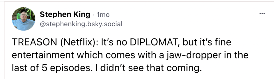 A new app, a new show, but the same old Stephen King highlighting hidden gems on Netflix. This time the author flagged a thrilling espionage limited series called Treason on his Bluesky account.