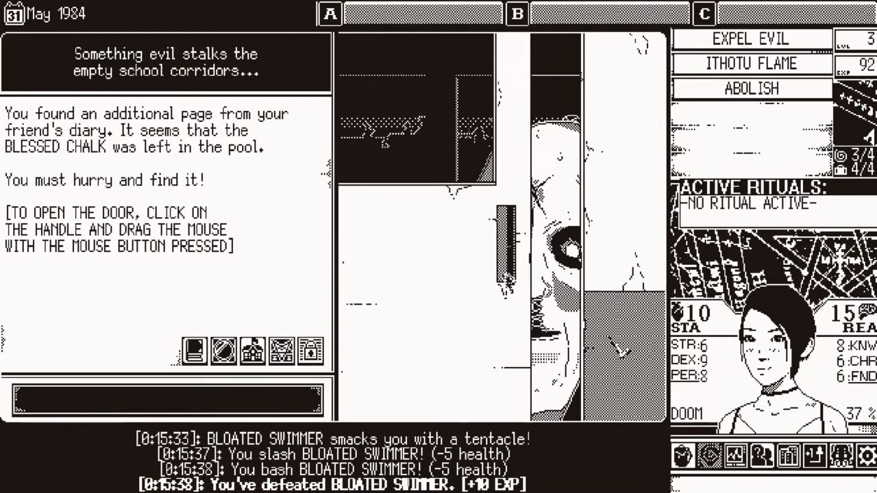 There were a number of features I didn’t get to experience in my limited demo. I didn’t level up, or learn how moves like “bow” and “clap” work in combat. Anything beyond the basic combat and events system is still a mystery to me. World of Horror has tabs for spells, allies, town status, and old god, so it’s clear there’s a lot more to it. I’ve heard tell there’s an earlier version of the game that had many of these features, but has been removed to prep for a final polished version. The only question is, when will we get that final version?
