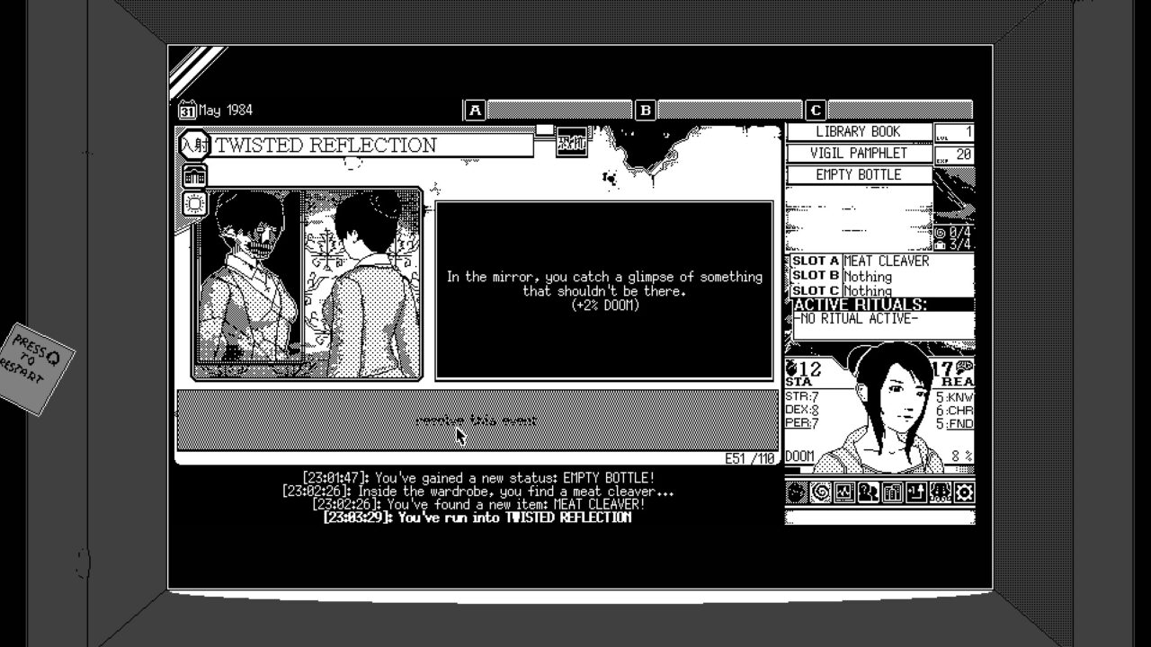 If you can look past the bugs, World of Horror is a monumental accomplishment. Even just looking at the art, it’s clear that Panstasz has a rare combination of talent and dedication. It manages to be disturbing and terrifying despite having only a single bit. It might not be perfectly balanced, but the breadth and creativity of the content needs to be commended. Which is why I’m not ending this with a score. World of Horror simply isn’t finished. I don’t typically review Early Access games for this very reason. I’m sure that World of Horror will be one of the best indie horror games… someday.
