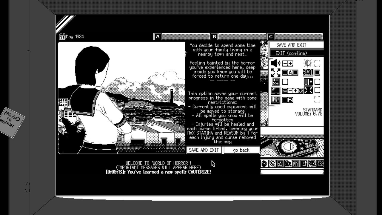Still, World of Horror deserves recognition. It’s a unique and wonderful game. I’m sure the bugs will be ironed out with time. So for the rest of the review, I’m going to talk about what makes World of Horror great. Just mentally insert after each paragraph *but these things are only great when the game doesn’t randomly break*. Got it? Good. On with the review.
