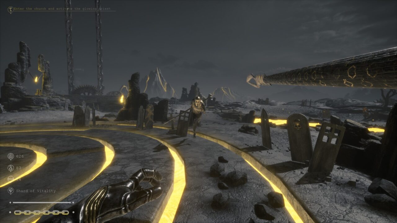 The premise of PERISH is pretty simple. You play as a soul trapped in purgatory. You want to get to Elysium. The only way to get to Elysium is to satisfy the Priests of Purgatory. And what the priests like is cold hard danake (gold). So you slash and shoot your way through hordes of baddies to get the danake that the priests so love. Along the way you’ll also have to solve some puzzles and, “clear the cogs of crushed skulls.” So… I guess some janitorial work?