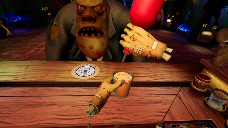 In Horror Bar VR you’ll learn to mix all kinds of grotesque drinks of various bodily fluids. And since chasing down a living person has a lower success rate than simply going to the restaurant, you will also learn to make a number of monstrous meals. Live rats, finger fries, brain burgers and more. There are a ton of mechanics to master if you want to make some good tips.