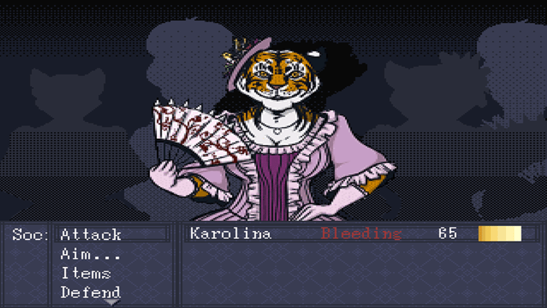 Or, rather, hungry rich animals. The game’s variety of rich people are all anthropomorphic animals, and it seems like they’re looking to get in touch with their more animalistic side. As such, you may need to fight them. Combat is like a turn-based RPG, with you taking control of Karolina as she has to do battle with the other rich people. Should she happen to win the battles at least she’ll have a nice victory meal to celebrate with.