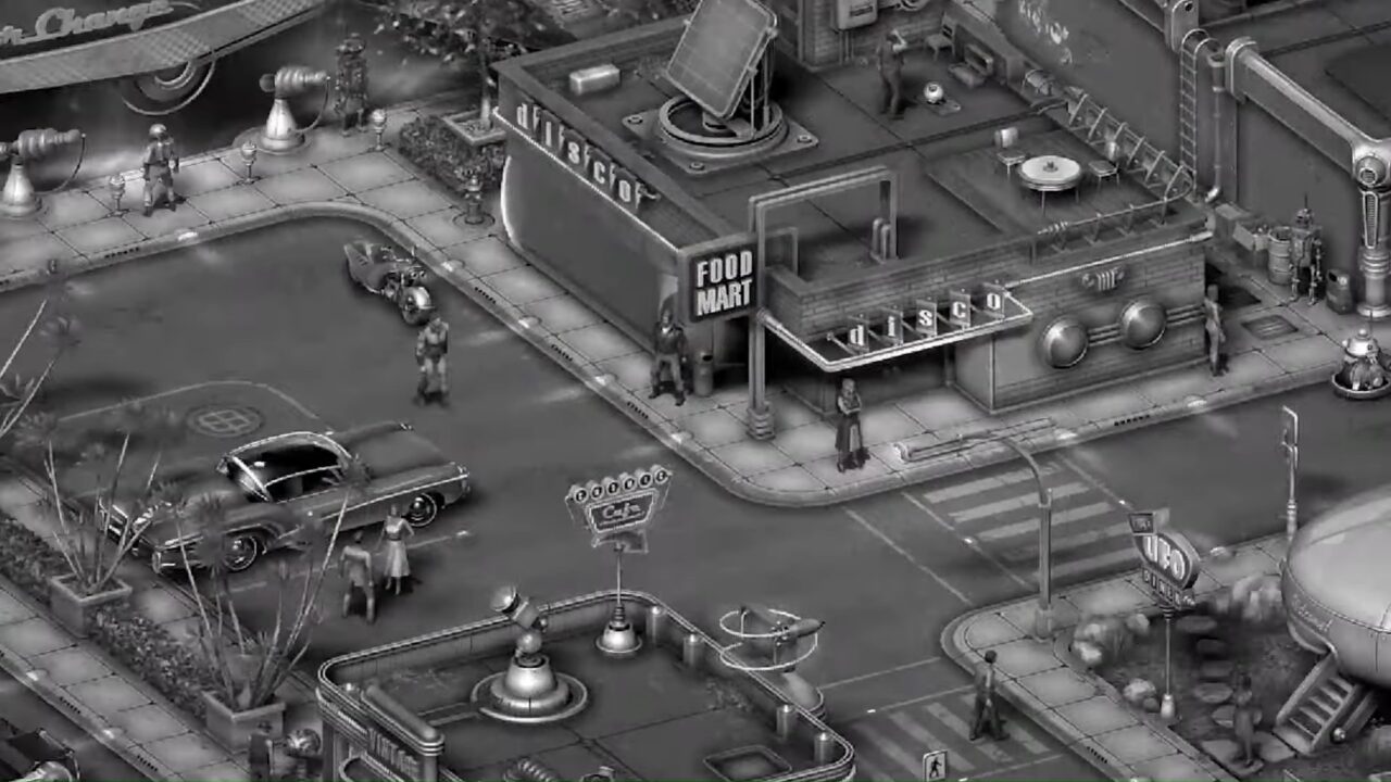At :17 we see an isometric cityscape of what looks like a 60’s street. It’s hard to pinpoint what it is we’re looking at here, but I would hazard a guess, based on what look like robots and laser guns, that this is a sort of retrofuturist isometric RPG. Imagine Fallout before, well, all that fallout.