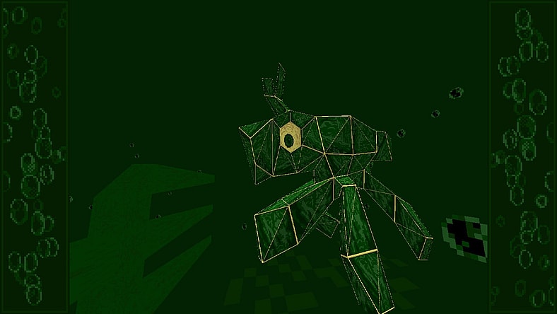 Unholy Eyeballs begins with you floating in a seemingly endless green sea. Armed with a green trident, you are suddenly awakened from your green sea-green sea dream back in your beige apartment. Thankfully, there’s a mysterious eyeball shaped like a disk that fits right in the drive of your console that will take you back to the green dimension.