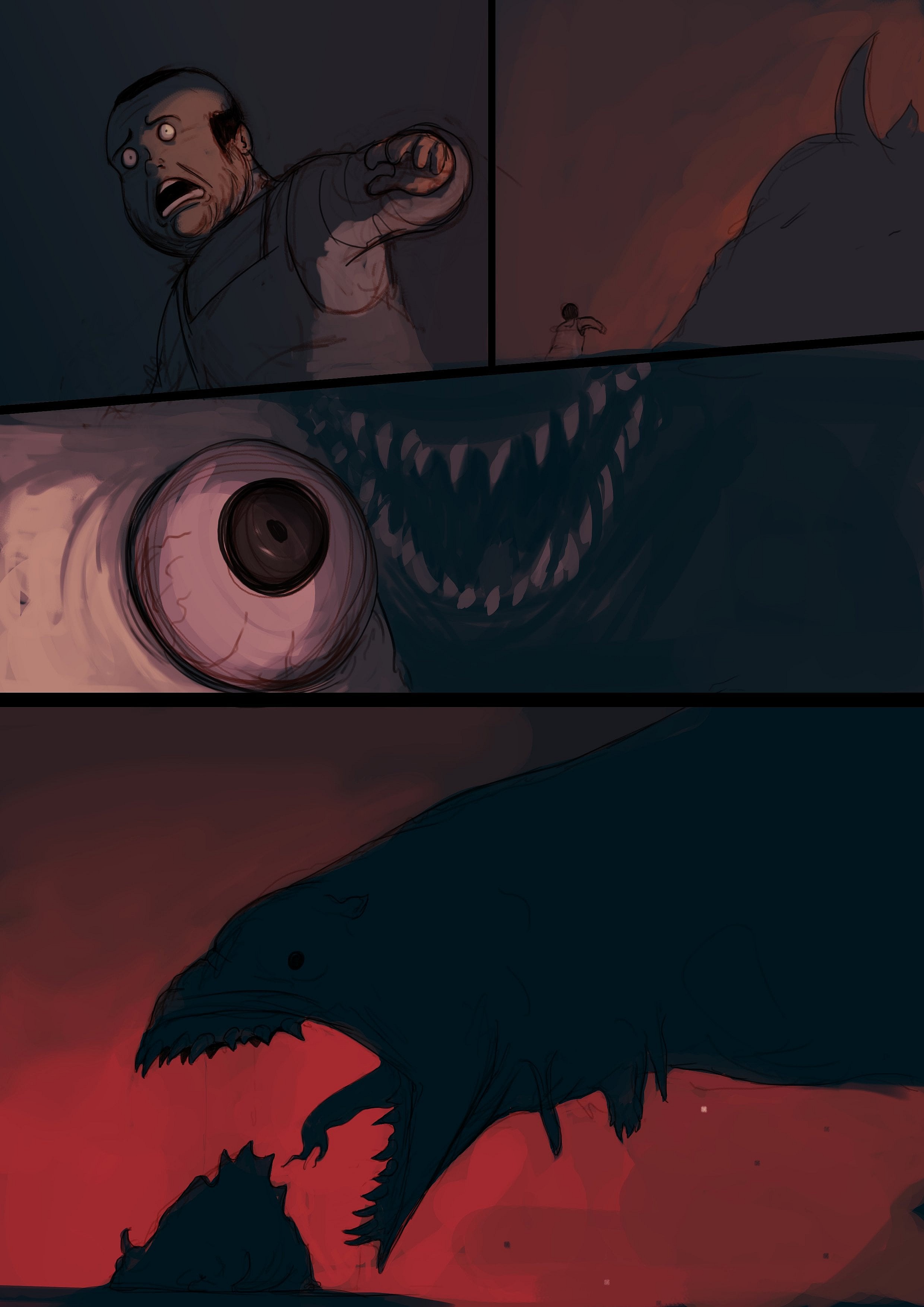 “I was a huge fan of the original film and Shin Godzilla. Godzilla being portrayed as an indestructible force humanity had to overcome was always intriguing to me. In a way, I wanted to make a love letter to Ishiro Honda’s original film, but add a more modern horror spin to it. For the most part, I started from scratch. I looked to nature for a lot of the design elements. Sharks, hippos, and bears come to mind, while stuff like extra limbs protruding from the neck as well as his amphibious background came from images of mutated frogs found around Chernobyl. With my version, I really wanted to highlight the mutant aspect of Godzilla, so I made sure he was deformed and his skin was drooping off the bone.”
