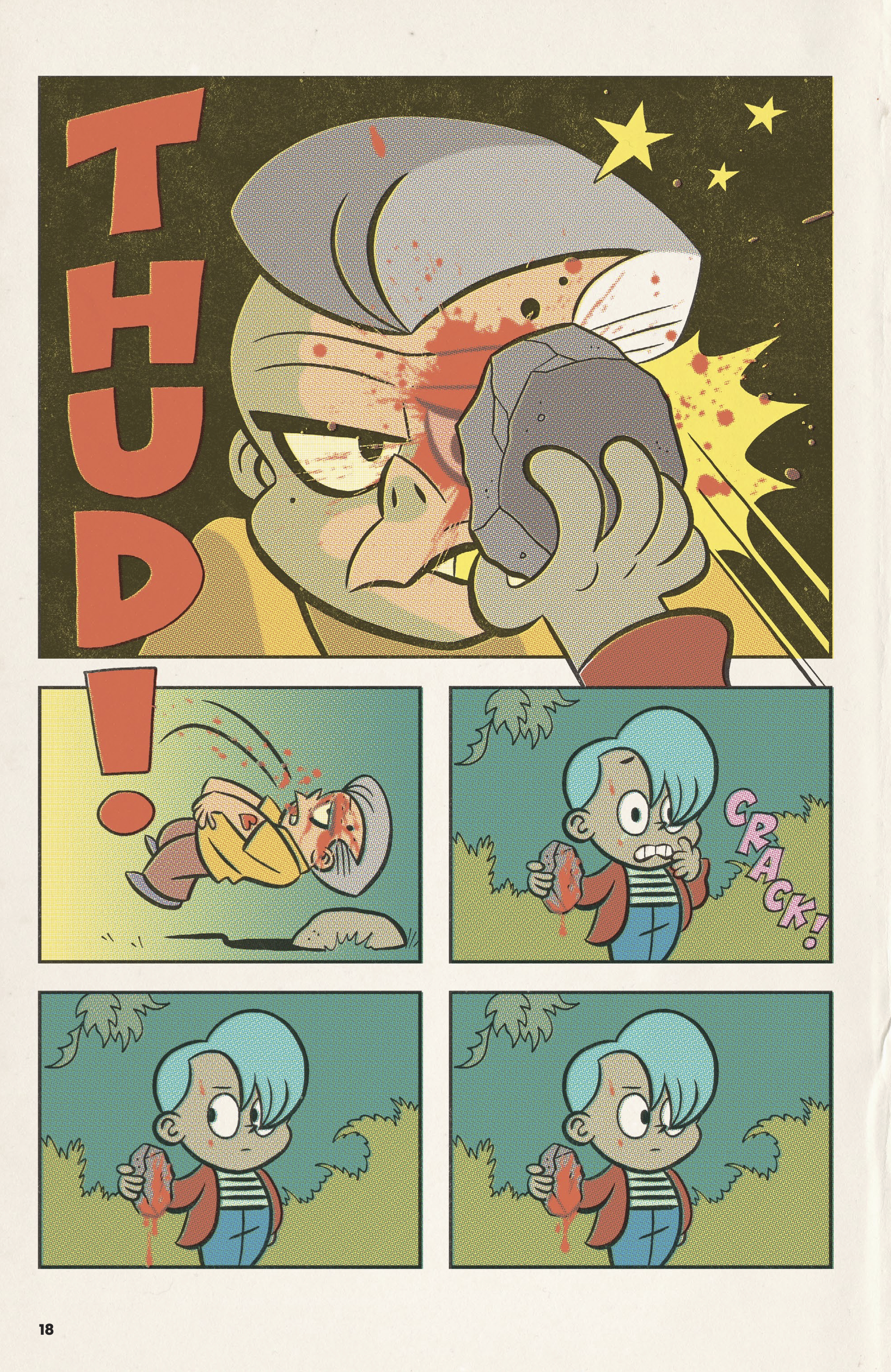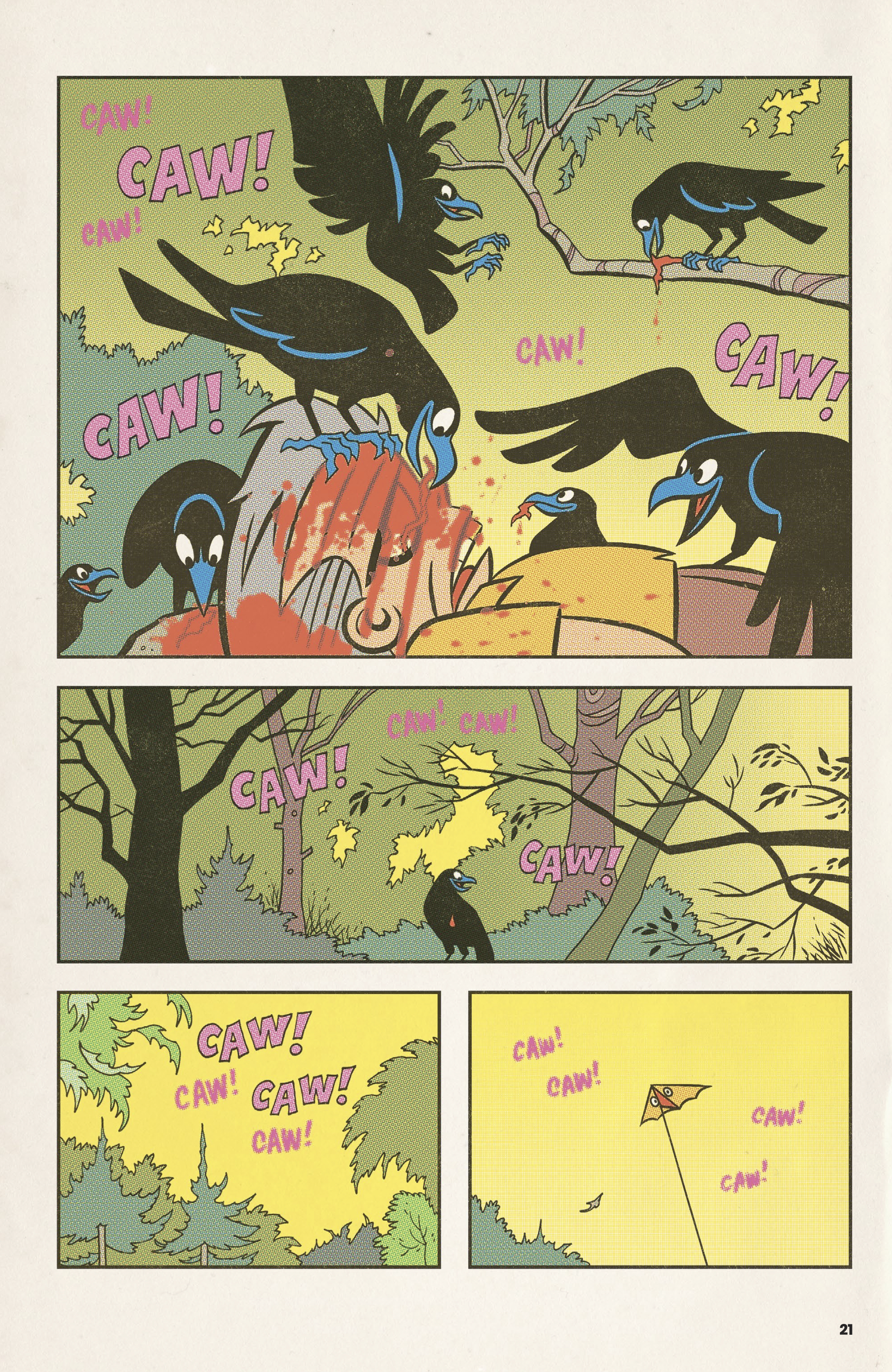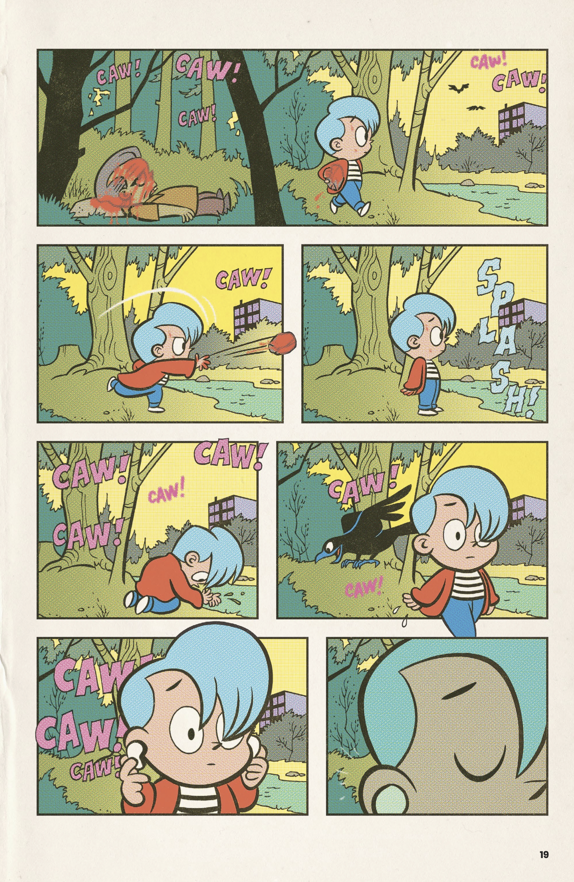 In Dwellings‘ first tale, “They Know”, a secretive young man named John Allan finds his conscience tested by an increasingly larger murder of crows that follow him after a sudden, violent, incident. How and why are these birds attracted to him, and what do they know? Can John maintain a grip on his reality and identity? A Poe-meets-Hitchcock thriller, full of bloodthirsty birds, blending retro cuteness with classic small-town terror. Dwellings is a collection of psychological horror tales, lovingly drawn in a vintage comics style to most perfectly invoke the half-remembered terrors of youth. The true meaning of the word nostalgia is, ‘to return home in pain’. So let’s get nostalgic, shall we?