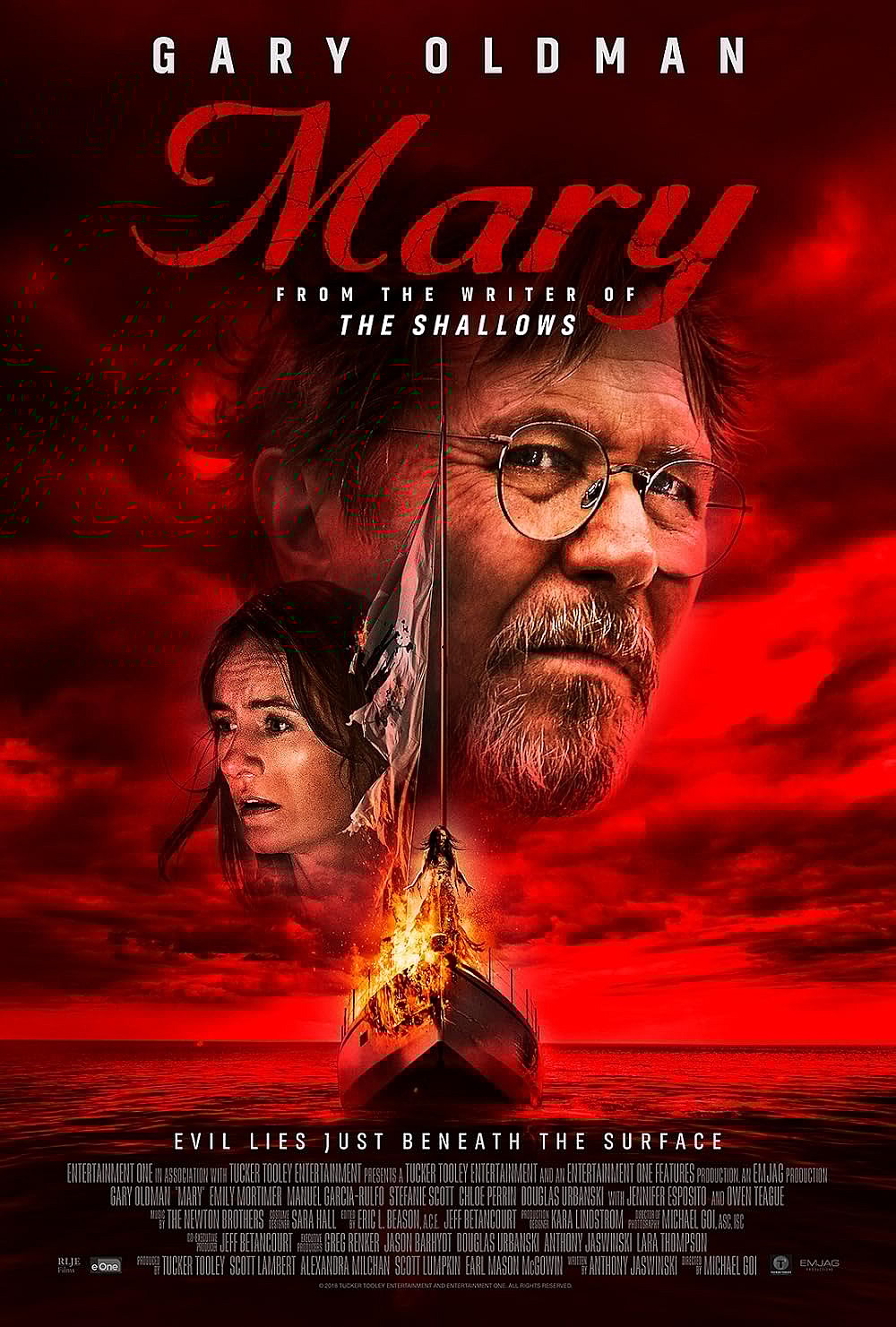 Released by our friends at RLJE Films and sporting a 4 out of 5 stars on Amazon Prime, Mary centers on the story of David (Oldman), who purchases a mysteriously abandoned boat at auction. Tired of working for someone else, David sees this as his last chance to own a fishing charter company alongside his partner, Mike (Garcia-Rulfo). However, David’s wife Sarah (Mortimer) is unsure of jumping in head first. After repairing the ship, they set out on their maiden voyage with their two daughters in tow toward Bermuda, slowly succumbing to madness aboard the titular Mary.