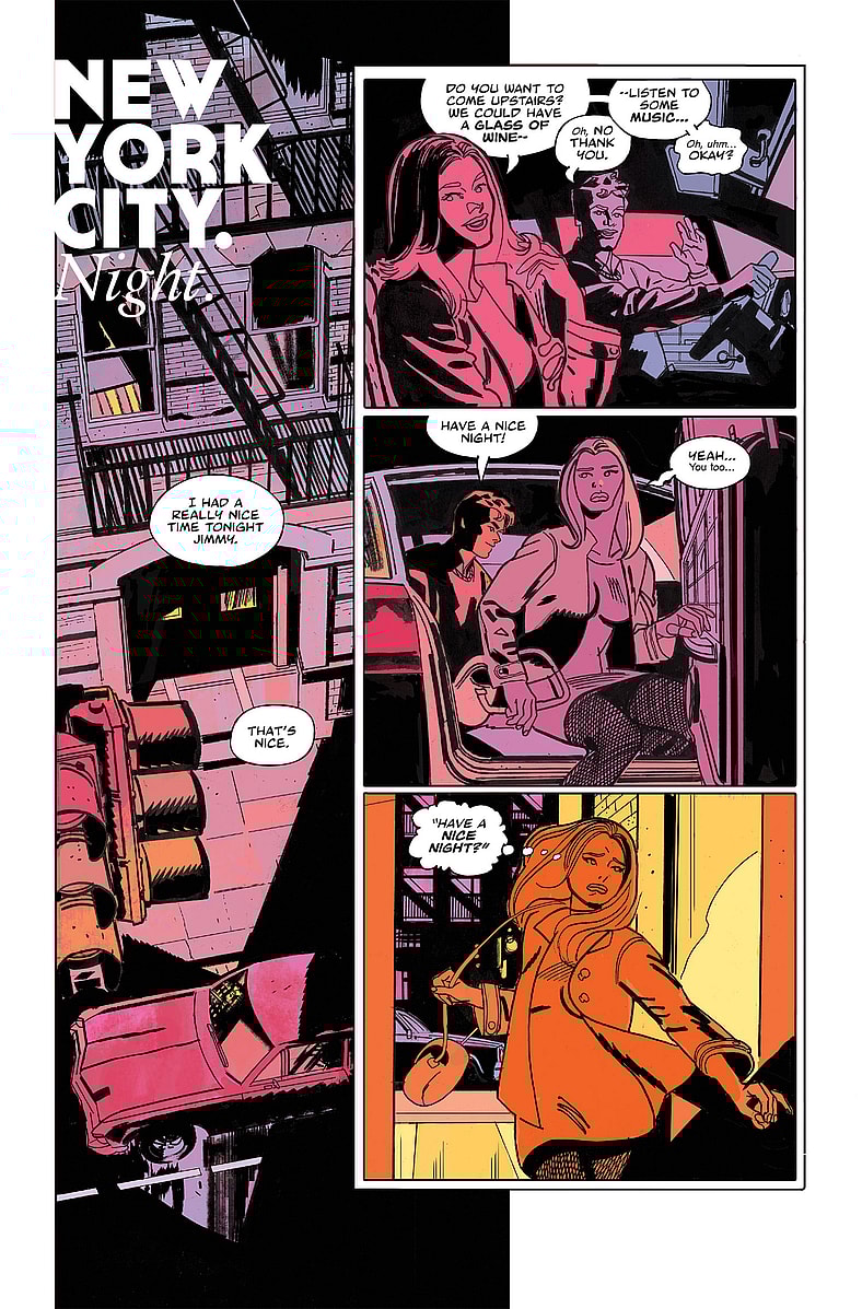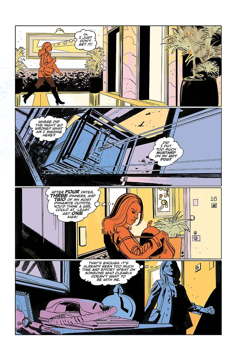 Starting with a kill was always Boss’ plan. “I wanted our first scene of the book to be a kill. Something that sets the stage in no uncertain terms that we’re making a slasher comic,” Boss explained. “But part of the fun of that is playing with the audience’s expectations. So, we set a scene where we follow the very horny Ronny back into her apartment, and horror fans think they know what’s going to happen. ‘Okay, they’re going to kill the pretty blonde lady.'”