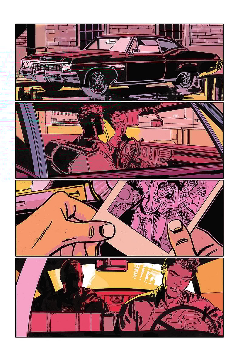 Turtulici was even able to craft a jumpscare on page four. “Trying to get a jumpscare in a comic is hard because most readers tend to scan an entire page briefly as they turn to it,” said Boss. “That said, I think Adriano did an incredible job here of selling the terror in this first glimpse of him in panel 4. The reader asks themselves ‘Where did that guy come from?’ and as they turn to the next page, realizing he must have been in the car even when Ronny was in there. How long was he back there, waiting?”
