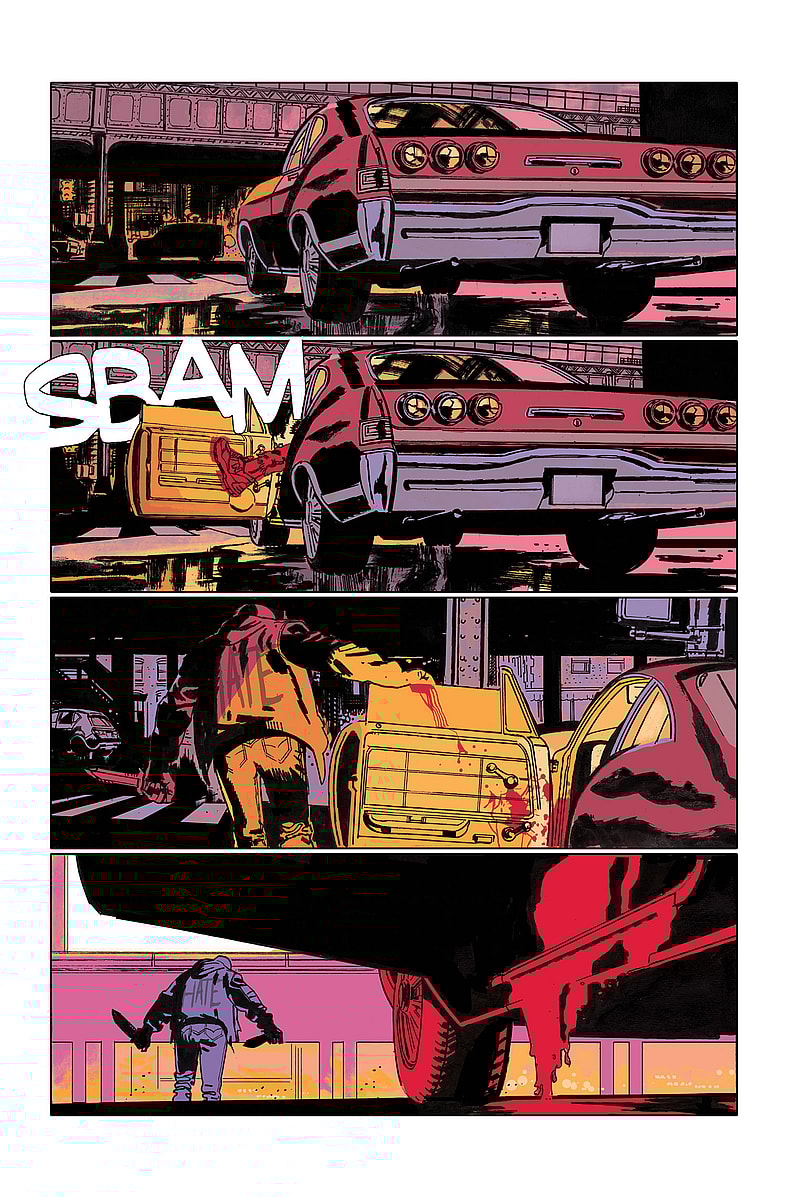 “We’ve just witnessed a murder, and I liked the idea of introducing our killer as if he’s still hungry, still craving for more. I hope it creates an unsettling feeling,” Turtulici continued. “The story is just beginning and the danger is far from over. Also, this is one of the pages we did for the pitch—I felt it wasn’t the right moment to be too subtle or suggestive. I wanted each page to hit hard, to set the tone of the series.”