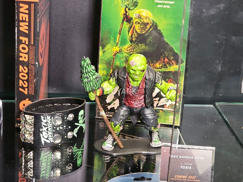 Also revealed on the show floor, Toxie from the brand new The Toxic Avenger reboot starring Peter Dinklage as Winston Gooze, a janitor who becomes a mutated vigilante after a toxic accident and fights corporate corruption in Tromaville. The figure comes with a punk bracelet. Expected in 2027.