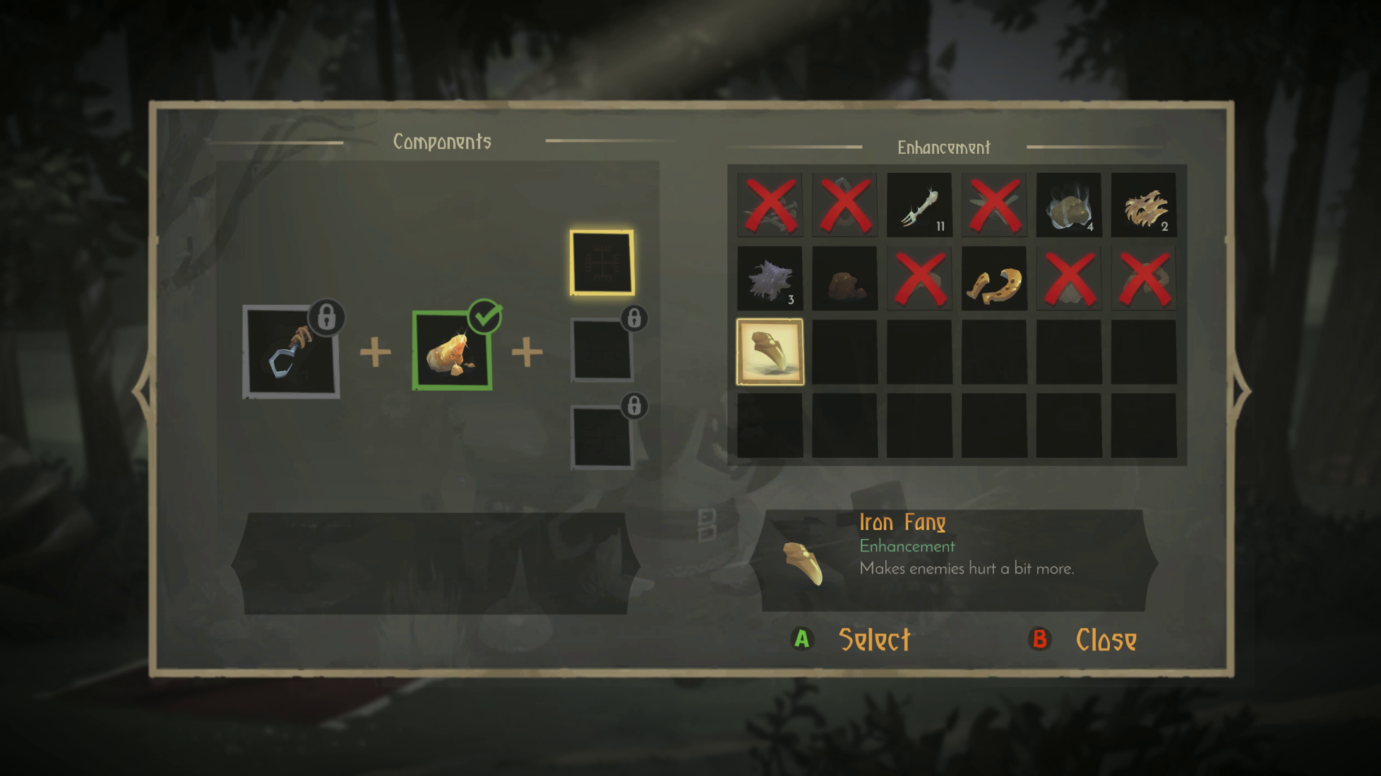 This severely restricted my playstyle. Instead of trying the interesting dialogue Yaga had to offer, I would stick to the kind option the majority of the time. Instead of using the dozens of magic consumable items to alter gameplay, I would adamantly refuse to use anything other than the basic healing bread. This all in the service of preventing the mean ghost from breaking my primary weapon, which would still happen frequently. It was infuriating. Occasionally, after putting all of my best materials into a new hammer, I would almost immediately encounter the smash ghost. Meaning I would have to go through the entire level, or die and risk losing some random items, in order to go and craft another.