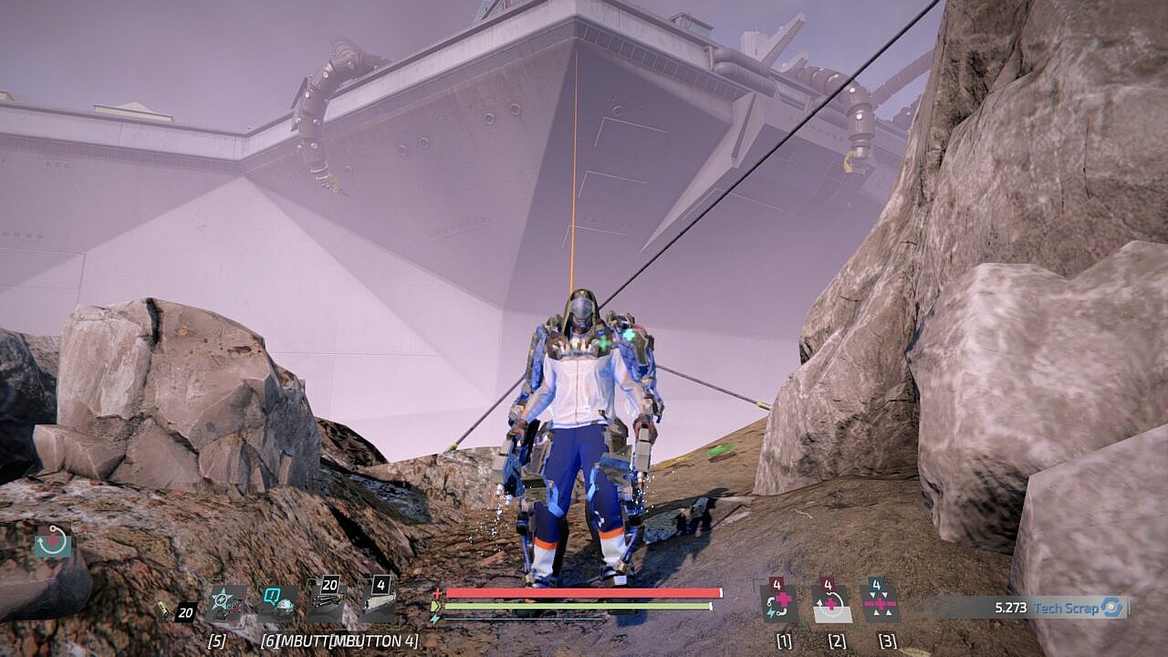 So I grinded for a few days between my other work (DLC for The Surge 2 isn’t exactly the most important thing on my to-do list, even if I am a huge fan), had some fun trying out a twin-rigged build, and finally managed to make my way to The Kraken. Accessible from that little islet where you first see the memory of Athena encountering A.I.D. in the toxic waters, a little boat is now there waiting to take you to the new content. You hop on and are transported to a little island. In the distance, the massive VBS Krakow looms. You ride a zipline up to the gargantuan decommissioned aircraft carrier, and the whole time you drink in the scale of what you’re about to encounter. Engulfing the ship in massive tentacles is some kind of robotic octopus, the eponymous Kraken. Truly, this must be a massive and harrowing adventure.