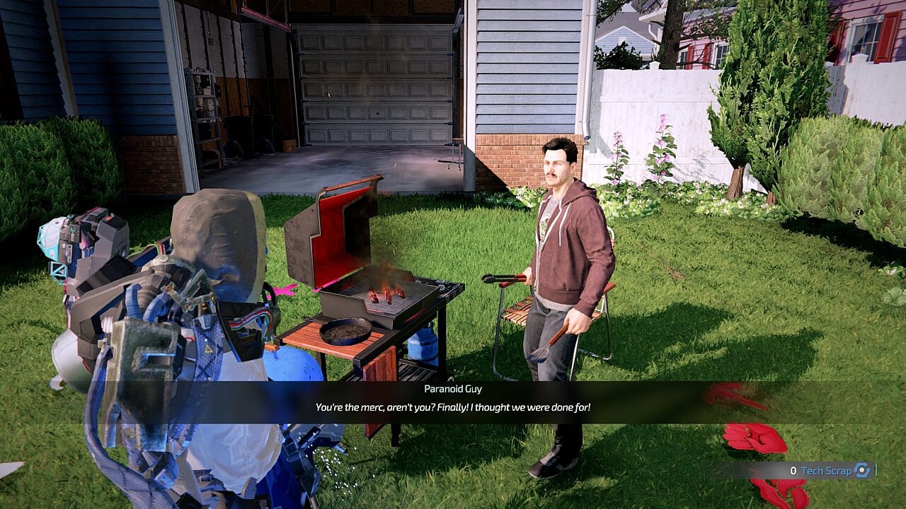Upon landing on the Krakow, you find yourself in the pleasant company of a friendly bloke named Norm. Norm is just grilling hotdogs in his yard, a picture of idyllic suburban life. He’s aware that the ship has been overrun by robo-pirates and that all his neighbors are dead, but there’s nothing he can do about it. So might as well just sit back, grill some dogs, and wait for some heroic adventurer to come and save the day. Norm is my favorite part of the DLC. Norm is cool. Norm can stay.