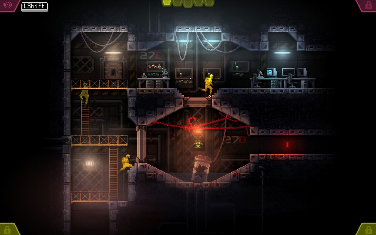 Carrion has surprisingly fluid gameplay. Perhaps that’s because you play as a creature that is more a viscous fluid than solid. I played on the PC and movement is done by clicking with the left mouse button. The Carrion creature will then lunge automatically across whatever environment you find yourself in, tendrils automatically finding a hold on the background or other surfaces. With the right click you may activate one arm-like tentacle, and use it to interact with objects. Open doors, rip off vent covers, or toss a person into the ceiling before dragging them kicking and screaming into your gaping maw.