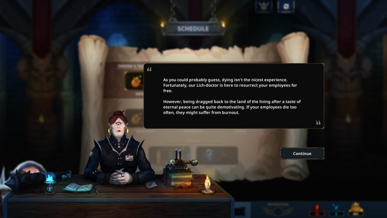 The aesthetic is pleasing. Crisp and detailed pixel art with backdrops that look like paintings. The world of Legend of Keepers is beautiful. Every attack is animated. Whether you’re firing a fireball at the adventurers, or your skeleton scientist is chugging chemicals so he can projectile vomit at enemies, it’s all lovingly animated. In my time with Legend of Keepers I kept finding new things to enjoy. Setting up dungeon defenses is great, and the random events and upgrades from the schedule board keeps things fresh. All in all, this isn’t a job I think I’m going to quit anytime soon. You can pick up your copy of Legend of Keepers HERE.