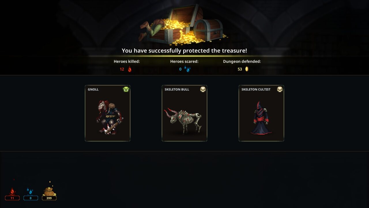 The game at first appears simple, but is surprisingly deep. Your job is to get a dungeon ready for adventurers. You’re not holding a party for them, but getting ready to murder them. You’ll have a preparation phase where you can add groups of monsters, traps, special spells, and later on, disasters. When setting up your monsters, you’re given a fairly simple roster to start with. I had a big ol’ orc, a flaming skeleton, and some type of poison elemental. As you play through and beat dungeons, you’ll get a choice to unlock new monsters. This is great for me, because I was noticing a trend: most of the time I was offered a skeleton of some sort.