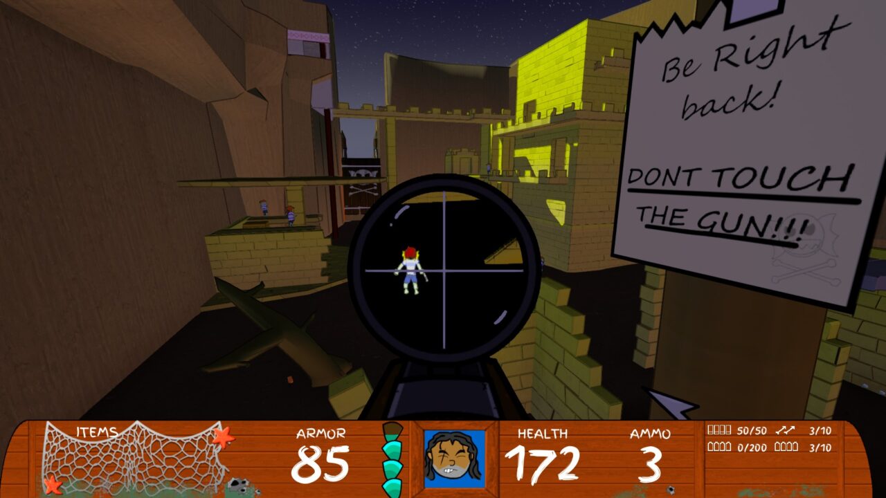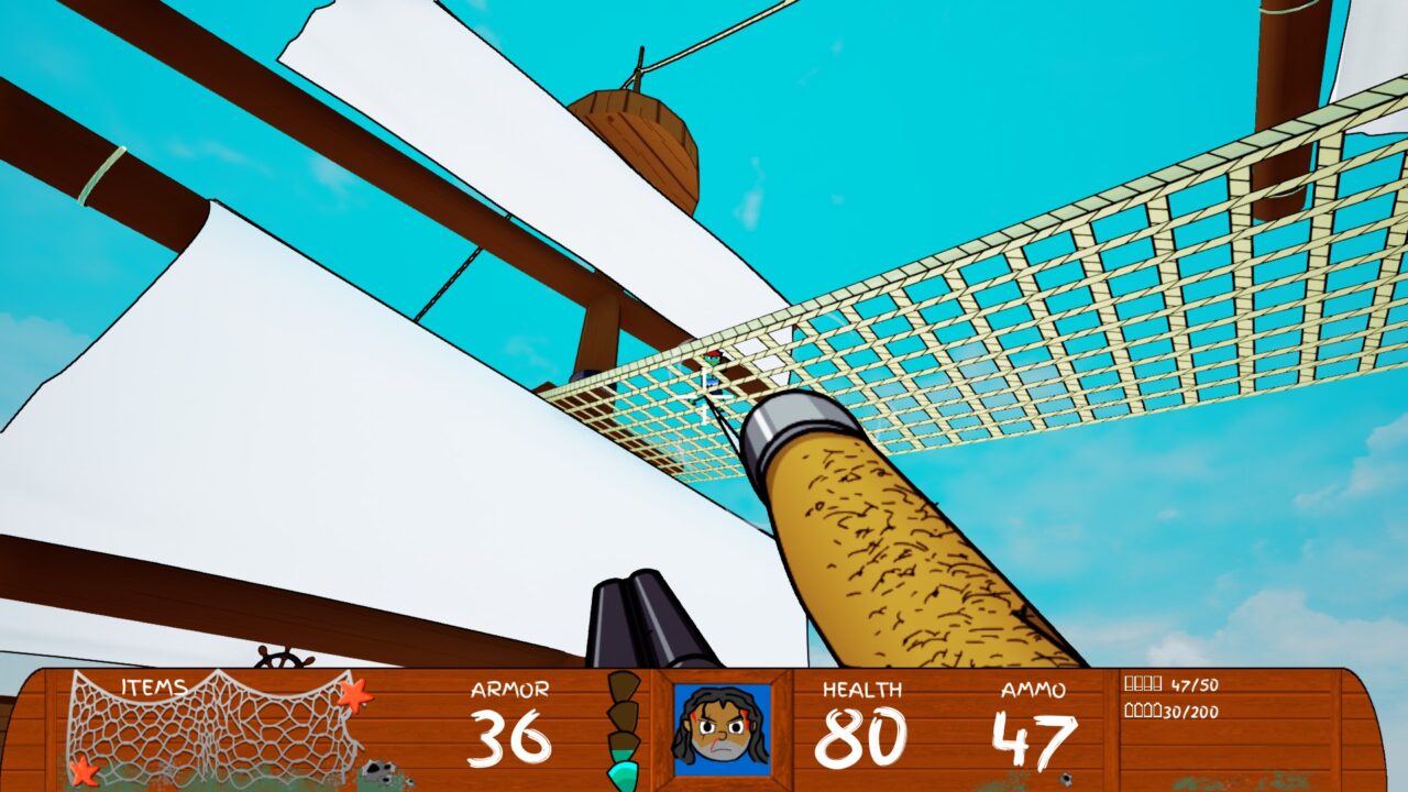 The level design is fantastic. I don’t know if the dev was a DOOM mapper in a previous life, or if they just get FPS mapping. The levels have a sense of verticality that I found refreshing. You won’t stay at ground level for long. The hook ensures that you can move skywards effectively. Enemy placement is fantastic. I never felt like I had been cheated by a blind corner. Deaths are earned in Fish Person Shooter. I love, but am terrible at, these types of games so I was earning a lot. The art style is cartoon-y and a bit goofy. Looking like a Saturday morning special about the dangers of high seas piracy, it’s still effective in highlighting the tropical locales.