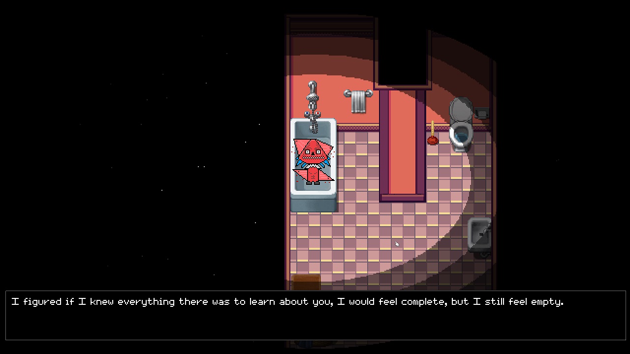 I’m frankly amazed at what’s there. The game can end at any time seemingly. There are 19 endings in total. Almost all of them come with some sort of text box musing about the nature of things. I’ll spoil one real quick. If you use the butcher knife on the tub, you’ll be treated to a text box explaining that you, the player, weren’t expected to do violence to a tub. If you continue to persist, Kirk will lament that they didn’t believe you capable of such a thing, before wondering out loud if expecting you to show restraint was somehow a “masturbatory reflection of the qualities they’d like to see in themself”. I persisted long enough that Kirk let me use the knife, which caused him to skin me alive, left opened up in the tub. They lamented that after opening me up to see how I worked, that I was boring. Oof.