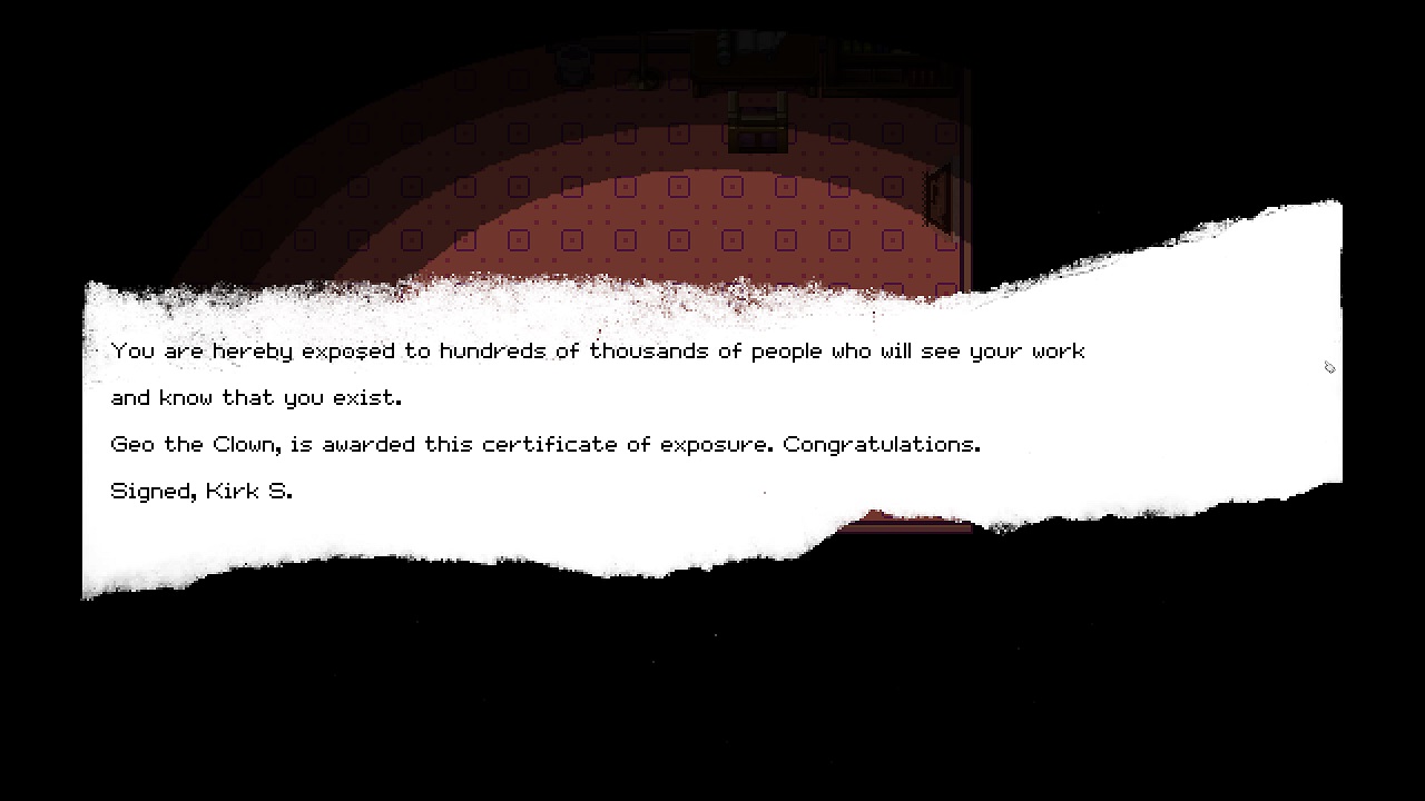 In Clown in A House I can almost guarantee you’ll get more than you bargained for. Clear out some time to play it, and experience some of the sharpest writing I’ve ever seen in an indie game. It’s so much more than the sum of its parts, and I think you’re in for a great time. I feel a bit ridiculous saying that Clown in A House may be my game of the year so far.